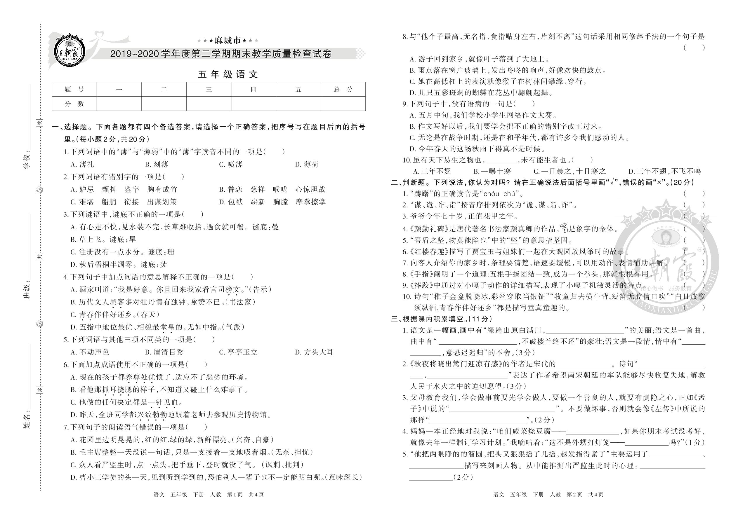 麻城市2019~2020学年度第二学期期末教学质量检查试卷五年级语文(人教版)