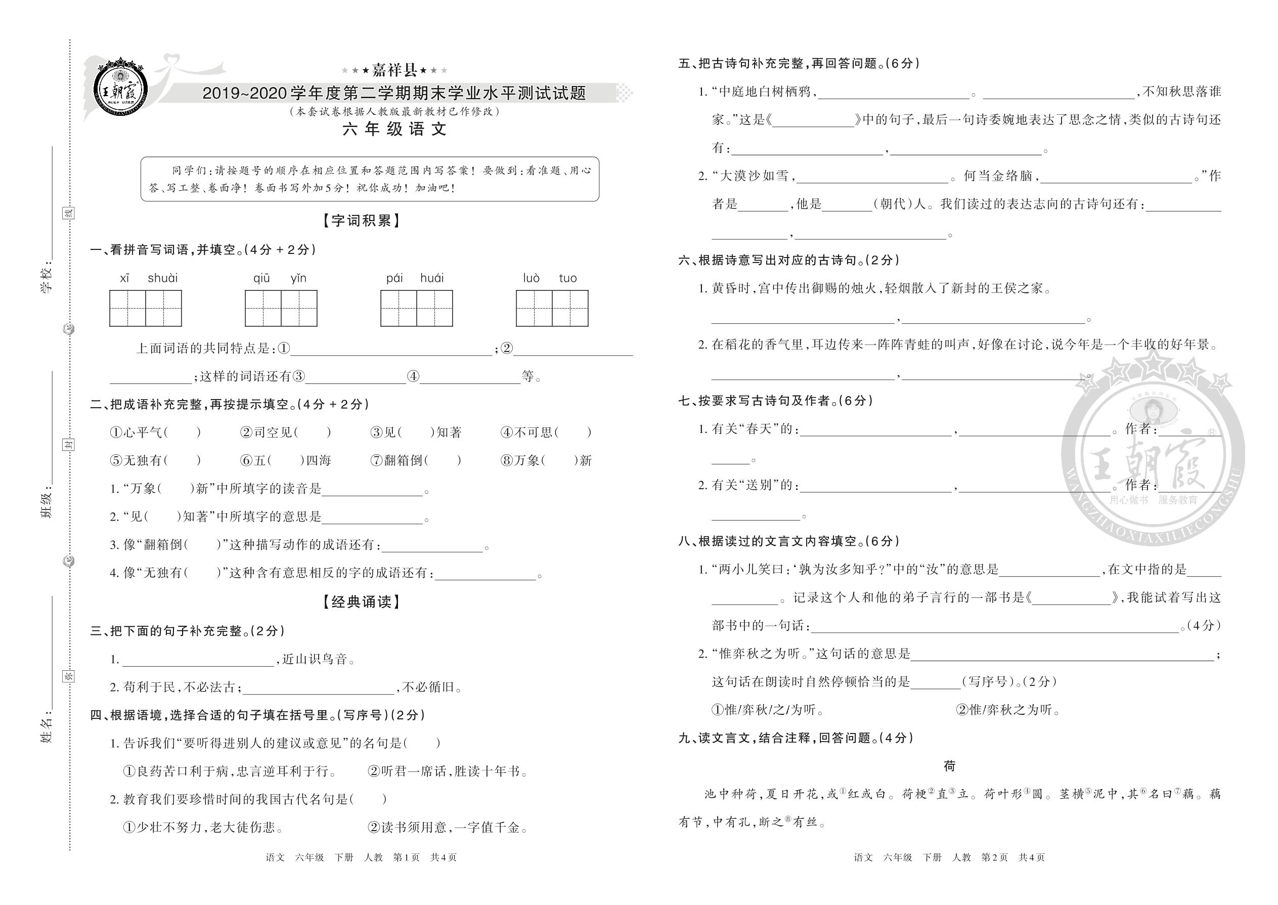 嘉祥县2019~2020学年度第二学期期末学业水平测试试题六年级语文(人教版)