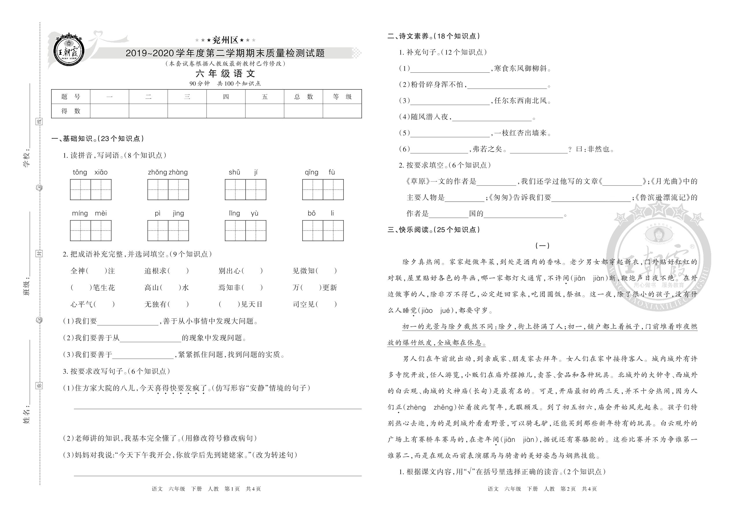 兖州区2019~2020学年度第二学期期末质量检测试题六年级语文(人教版)