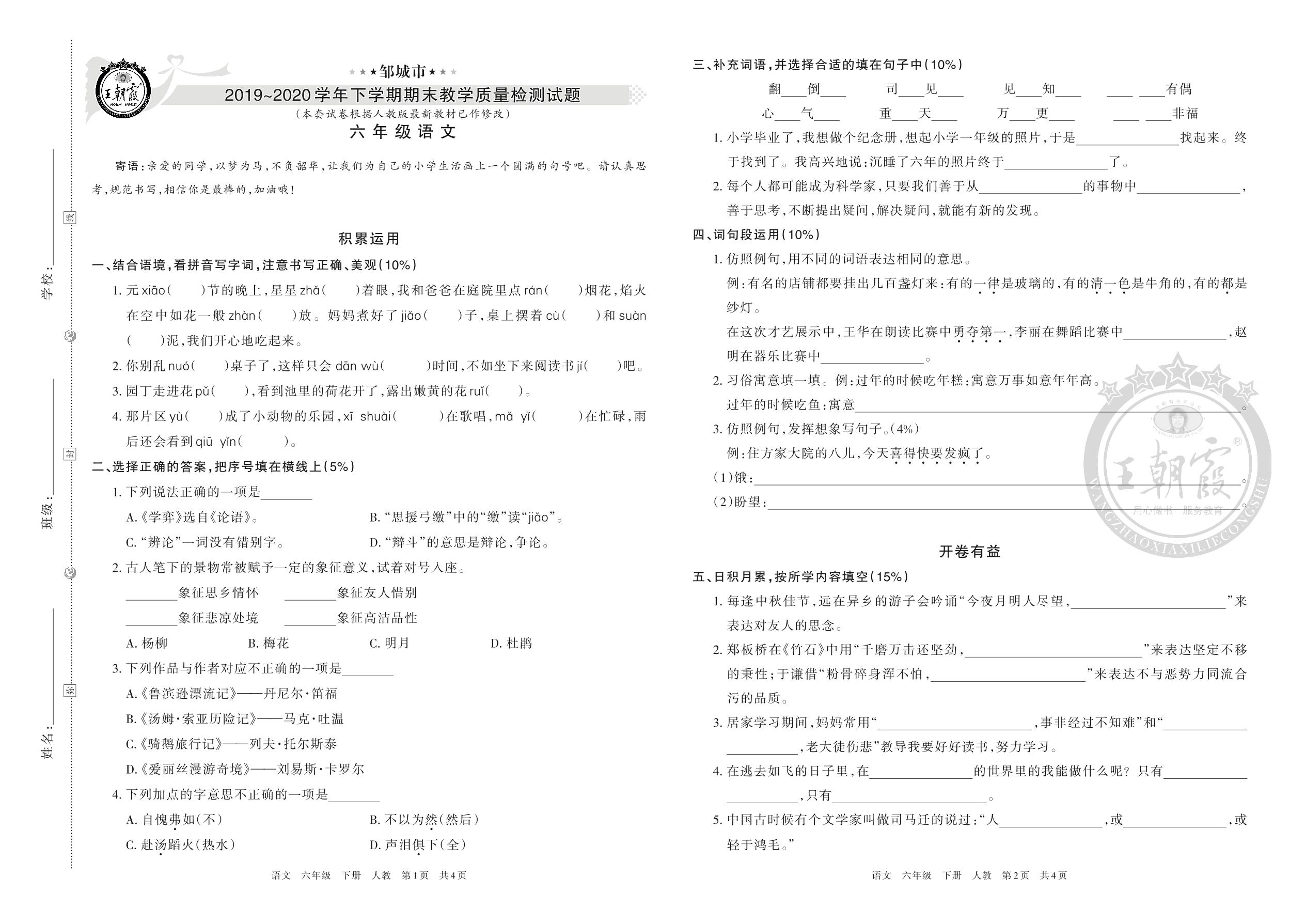 邹城市2019~2020学年下学期期末教学质量检测试题六年级语文(人教版)