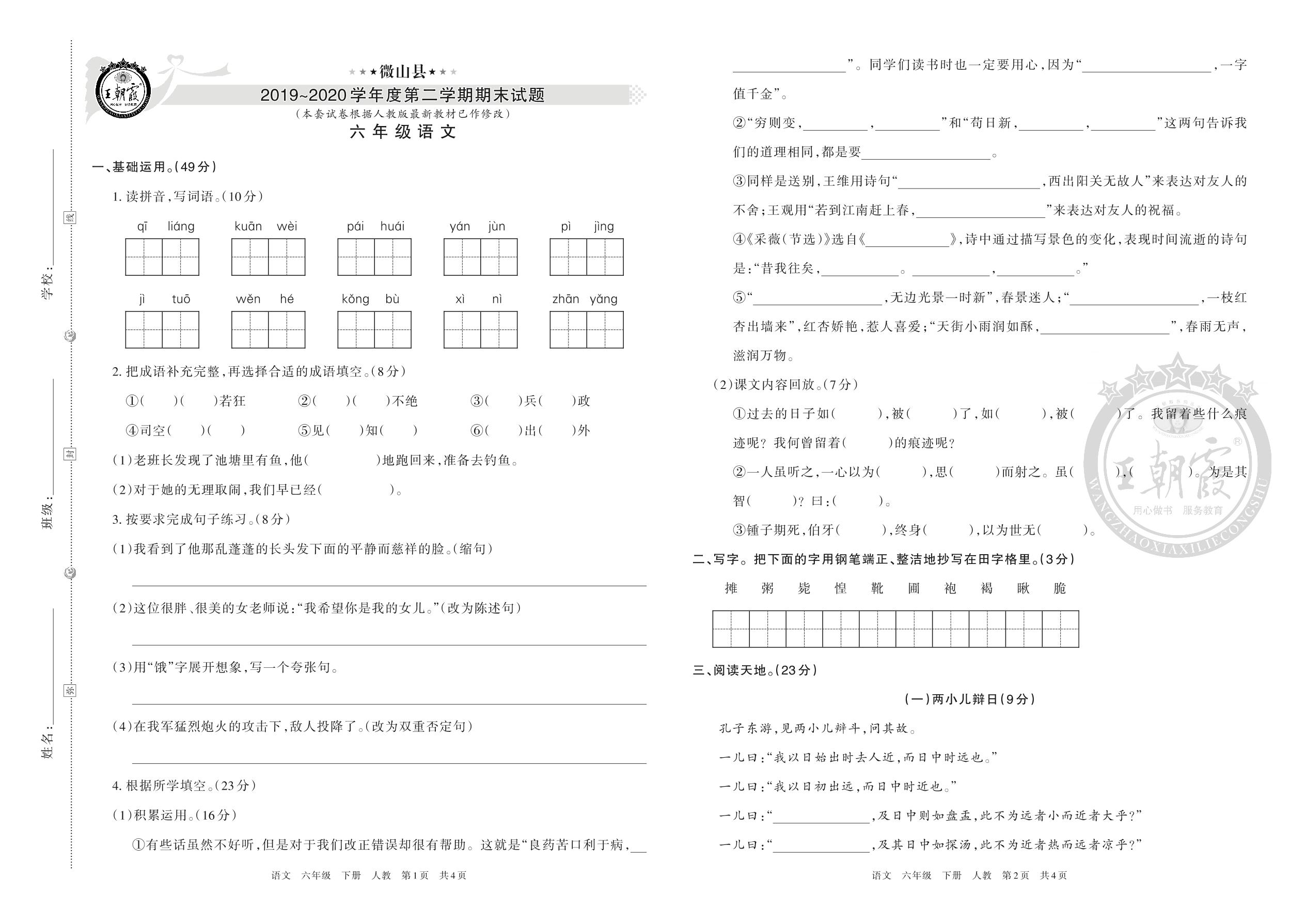微山县2019~2020学年度第二学期期末试题六年级语文(人教版)