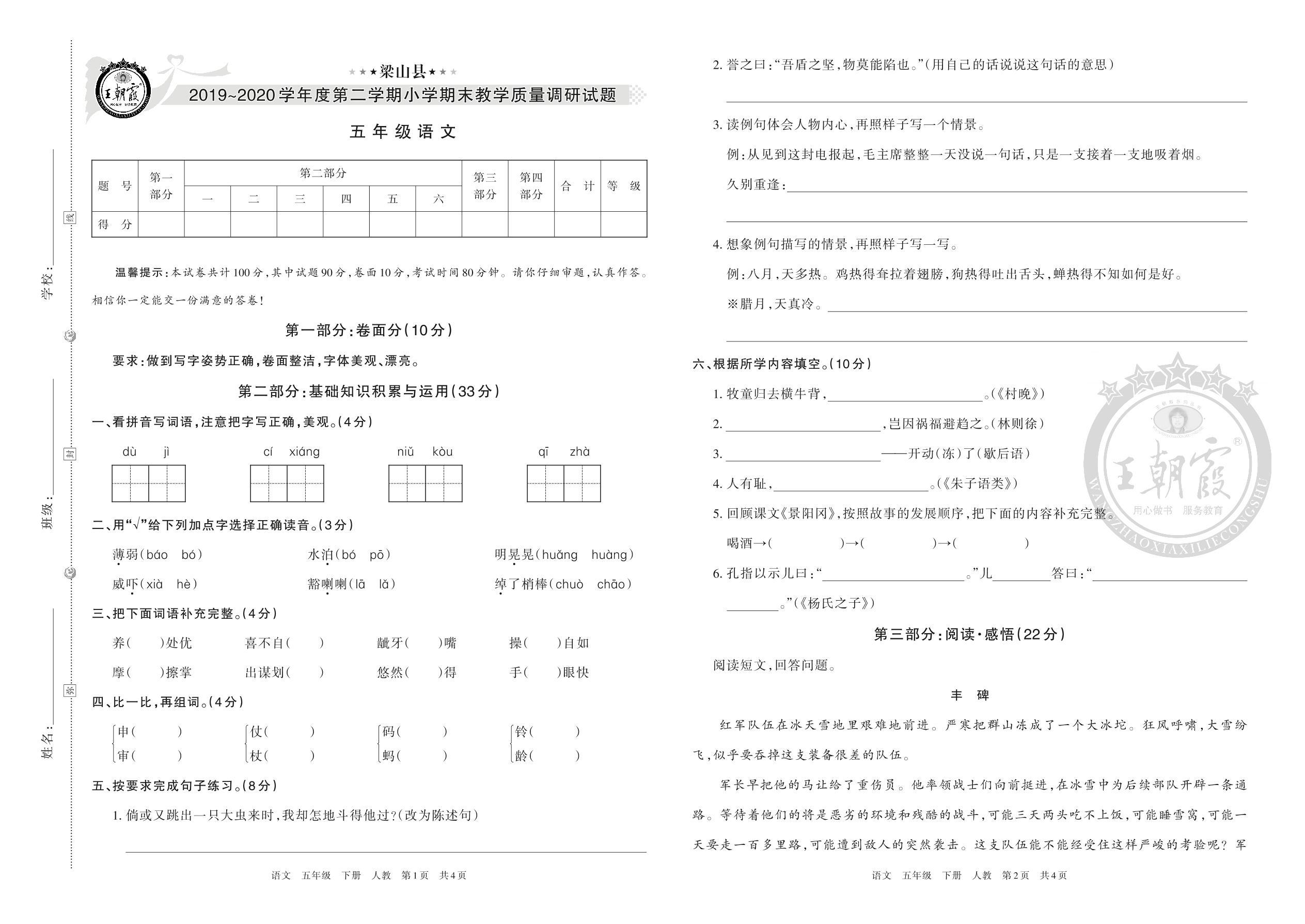 梁山县2019~2020学年度第二学期小学期末教学质量调研试题五年级语文(人教版)