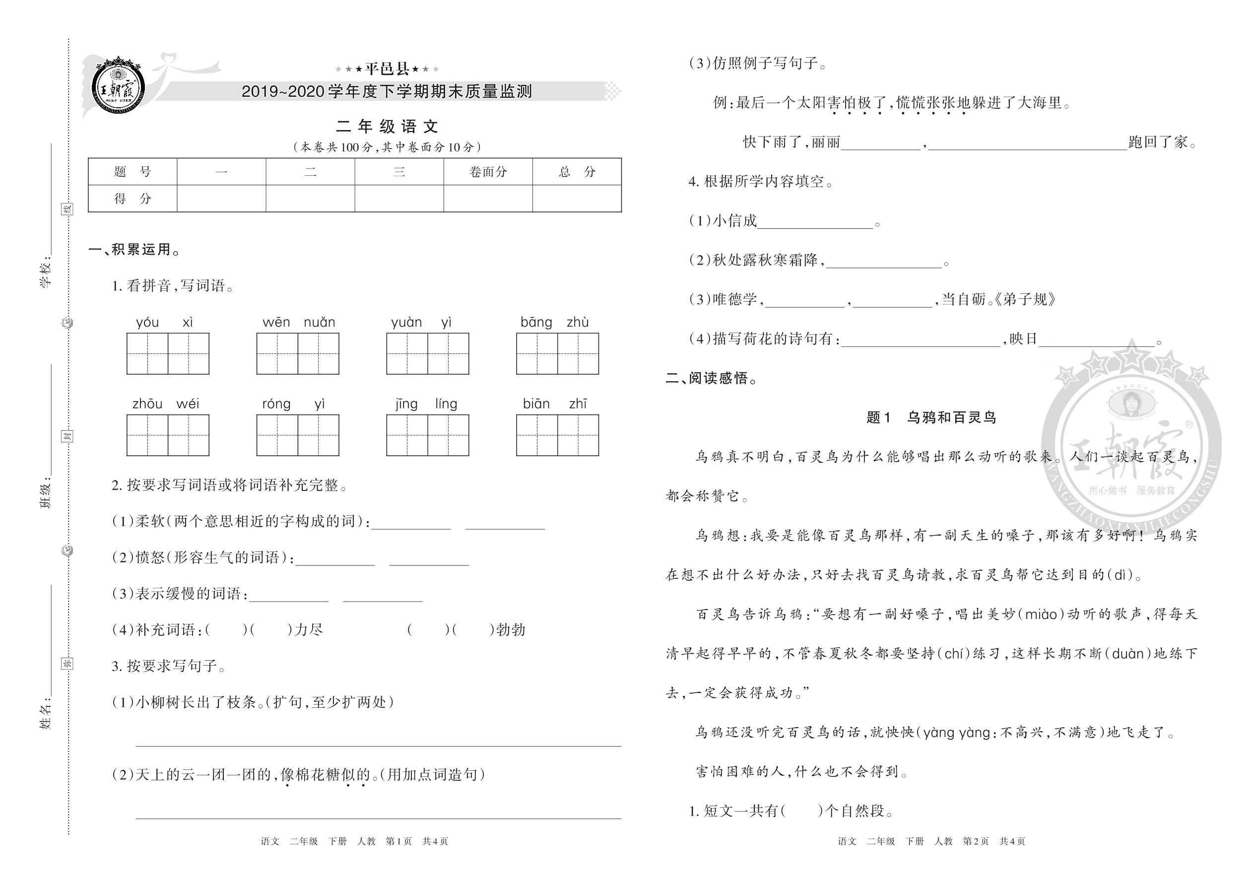 二年级语文人教版下册期末卷