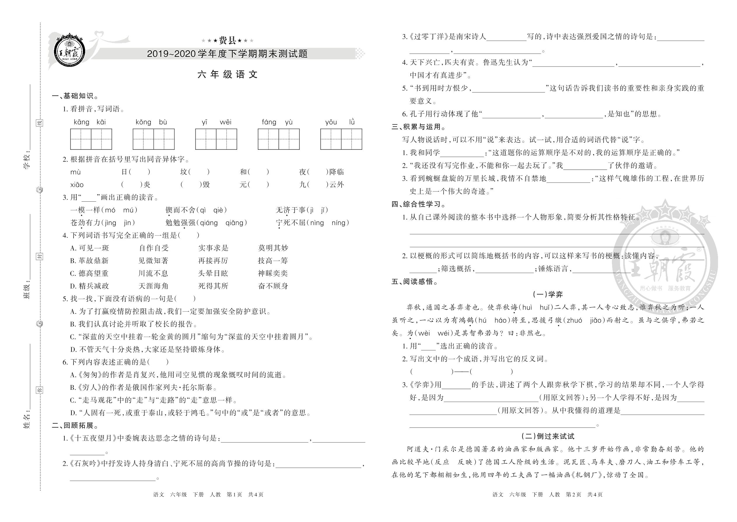 费县2019~2020学年度下学期期末测试题六年级语文(人教版)