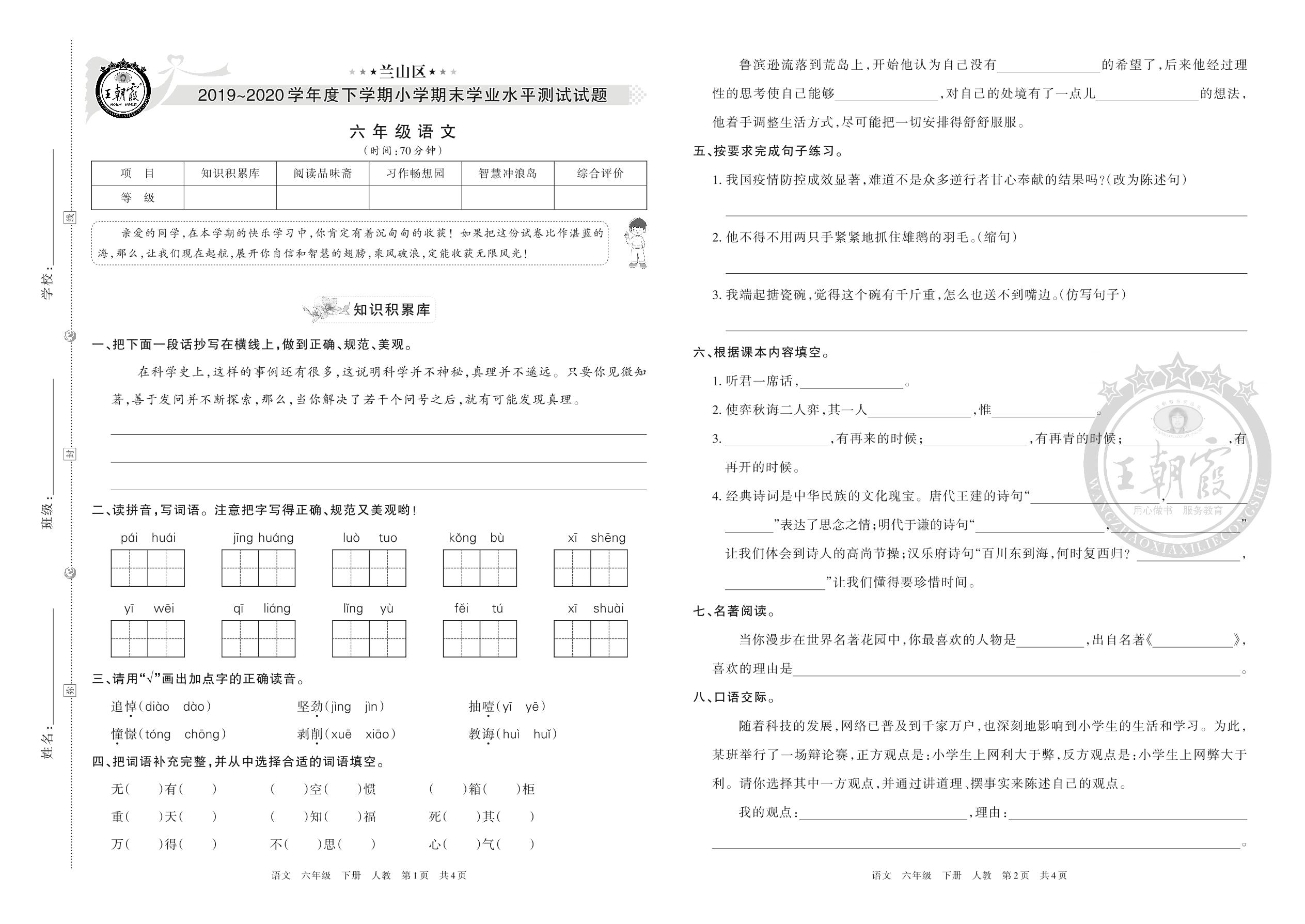 兰山区2019~2020学年度下学期小学期末学业水平测试试题六年级语文(人教版)