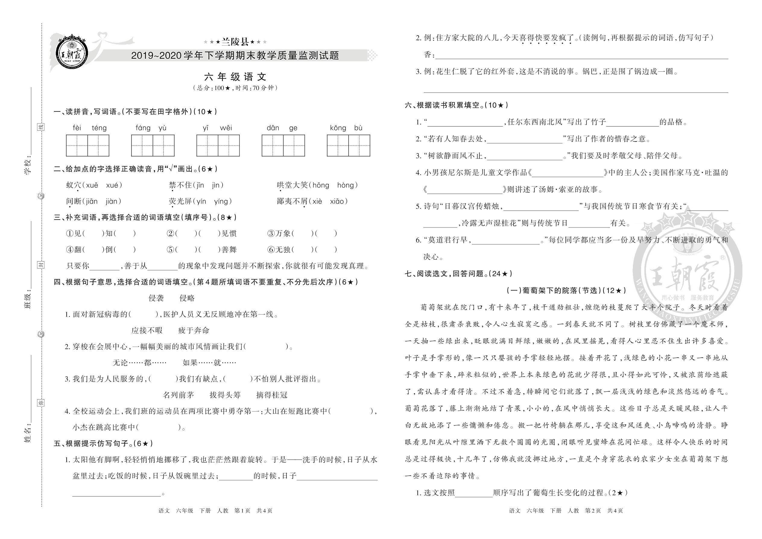 兰陵县2019~2020学年下学期期末教学质量检测试题六年级语文(人教版)
