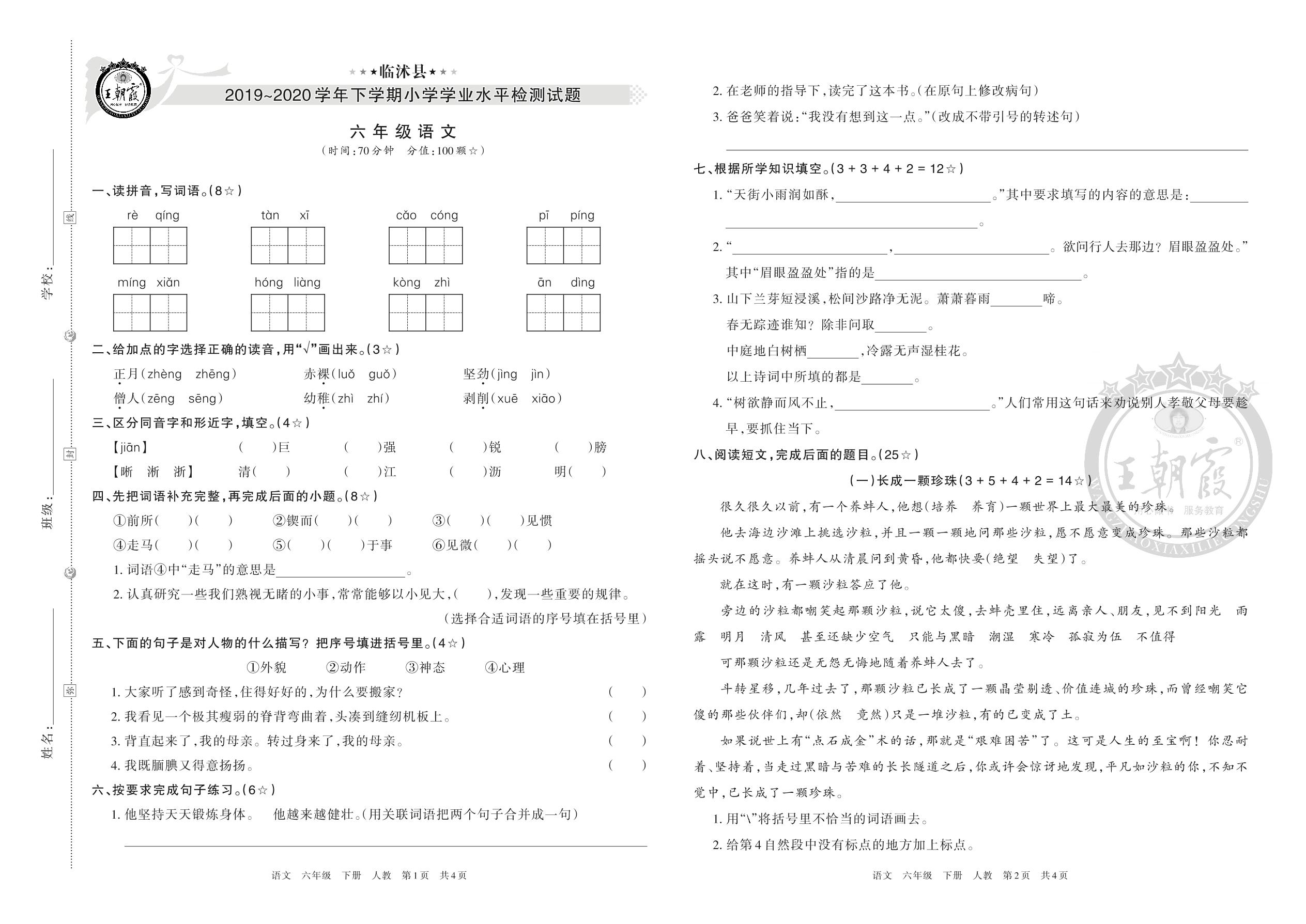 临沭县2019~2020学年下学期小学学业水平检测试题六年级语文(人教版)