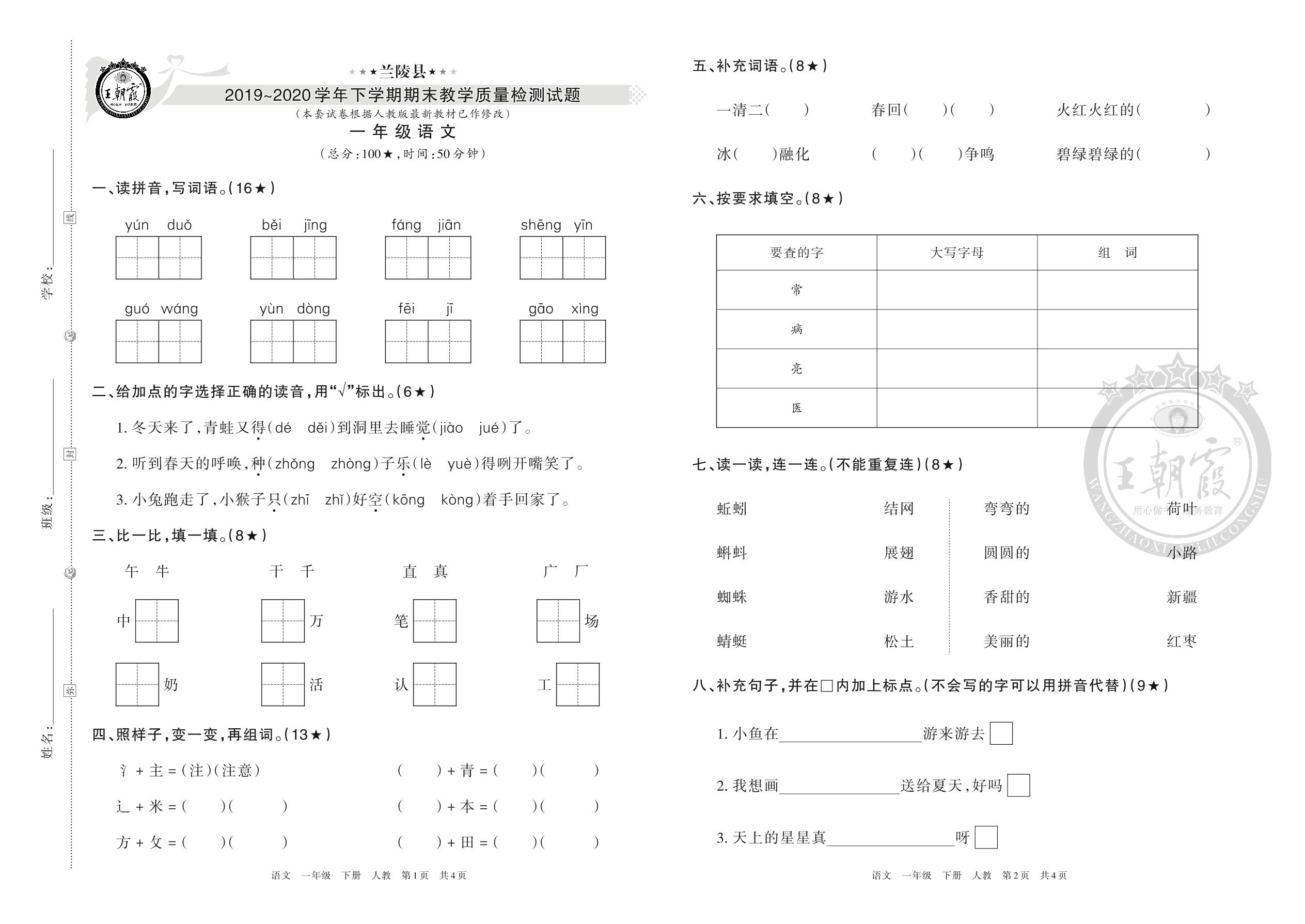 兰陵县2019~2020学年下学期期末教学质量检测试题一年级语文(人教版)