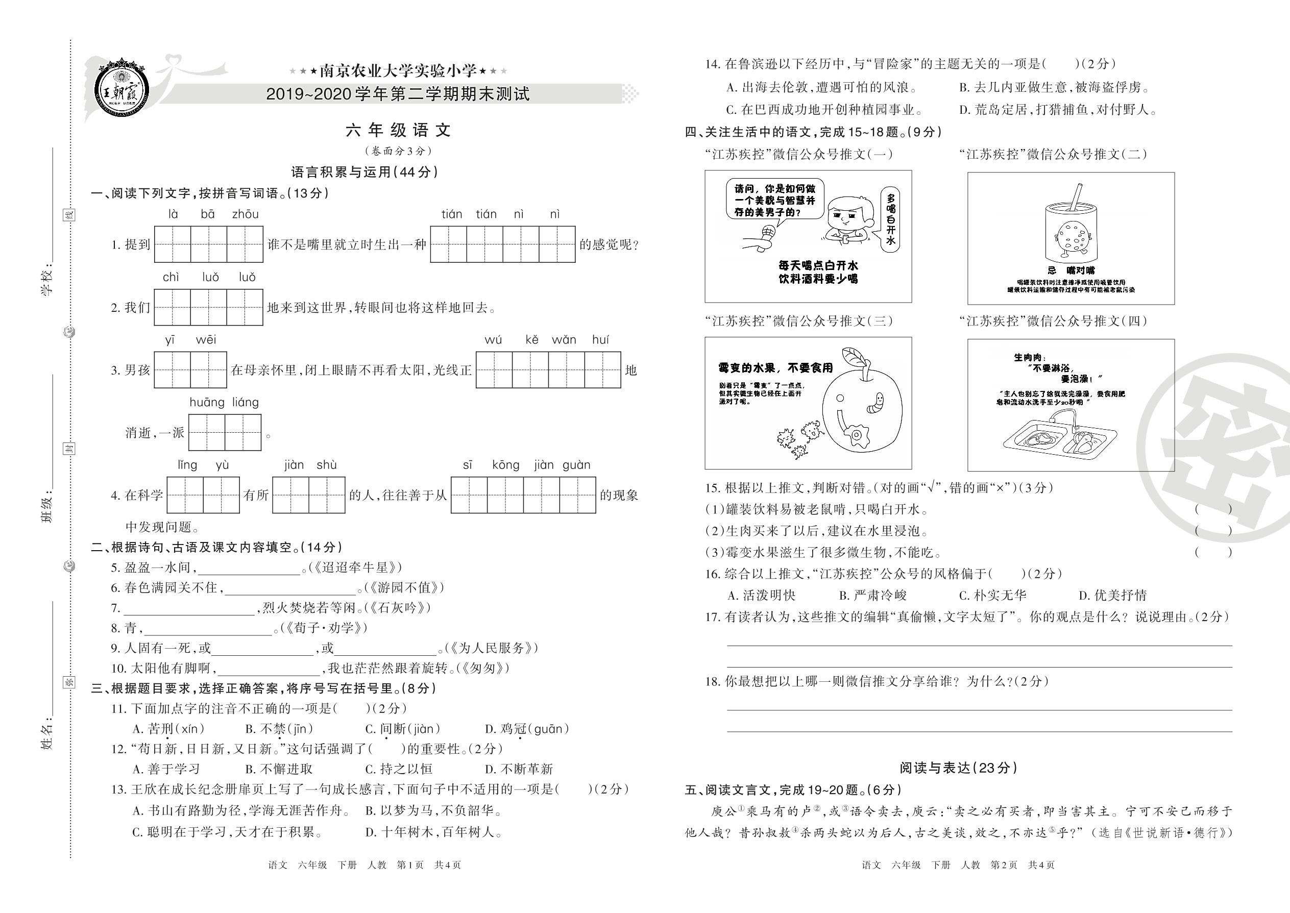 南京农业大学实验小学2019~2020学年第二学期期末测试六年级语文(人教版)