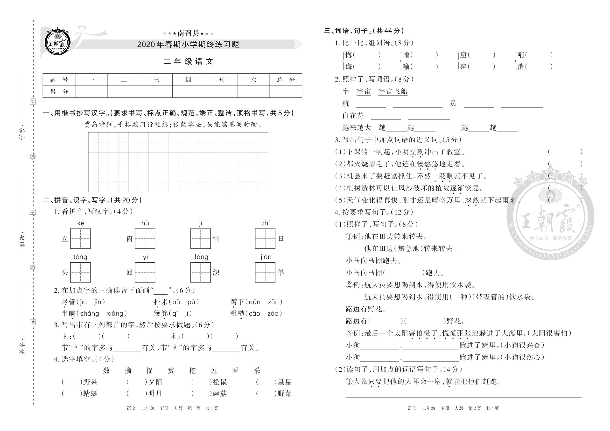 南召县2020年春期小学期终练习题二年级语文(人教版)