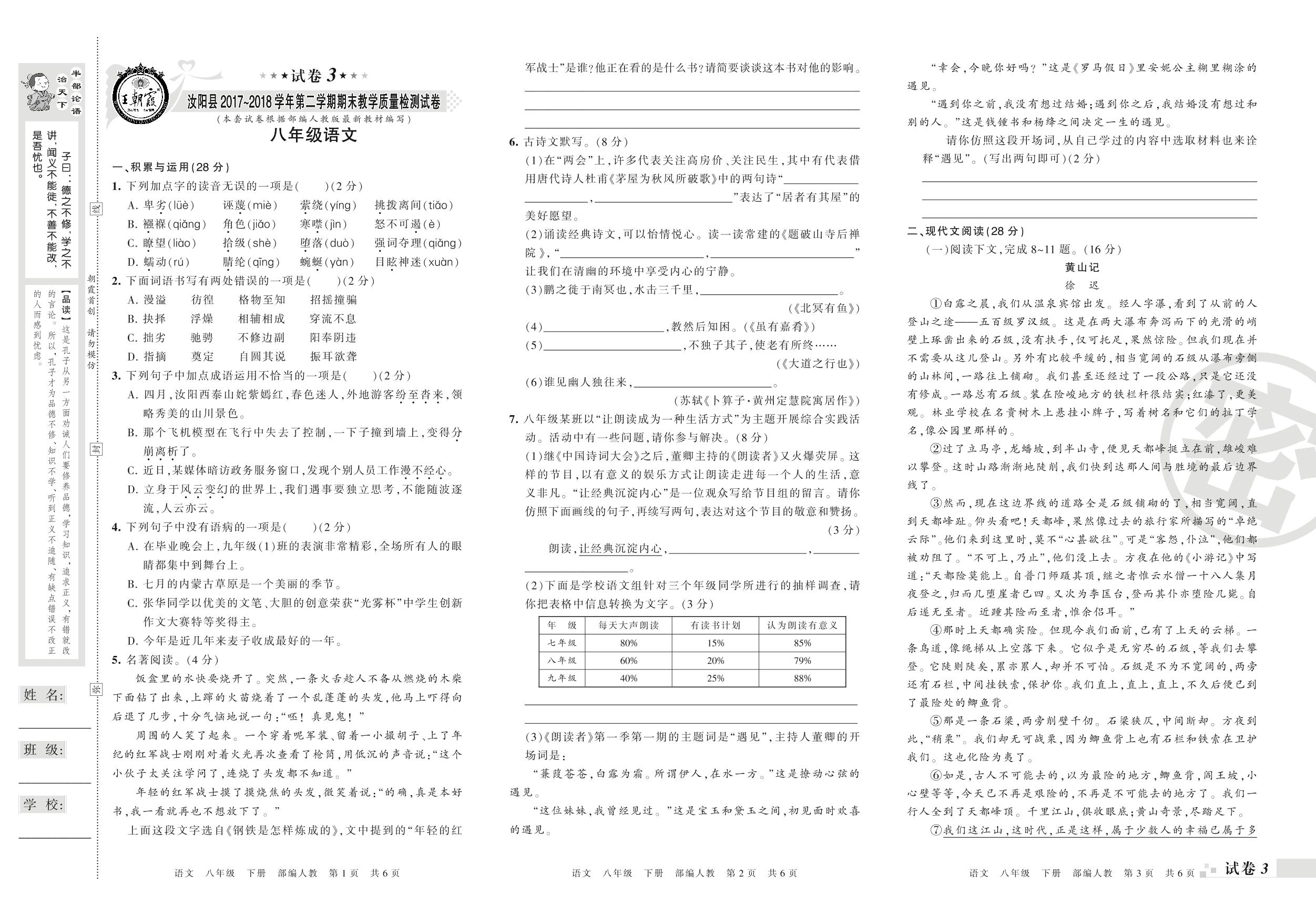 2017-2018学年第二学期洛阳市汝阳县八年级语文试卷(人教版)【3】