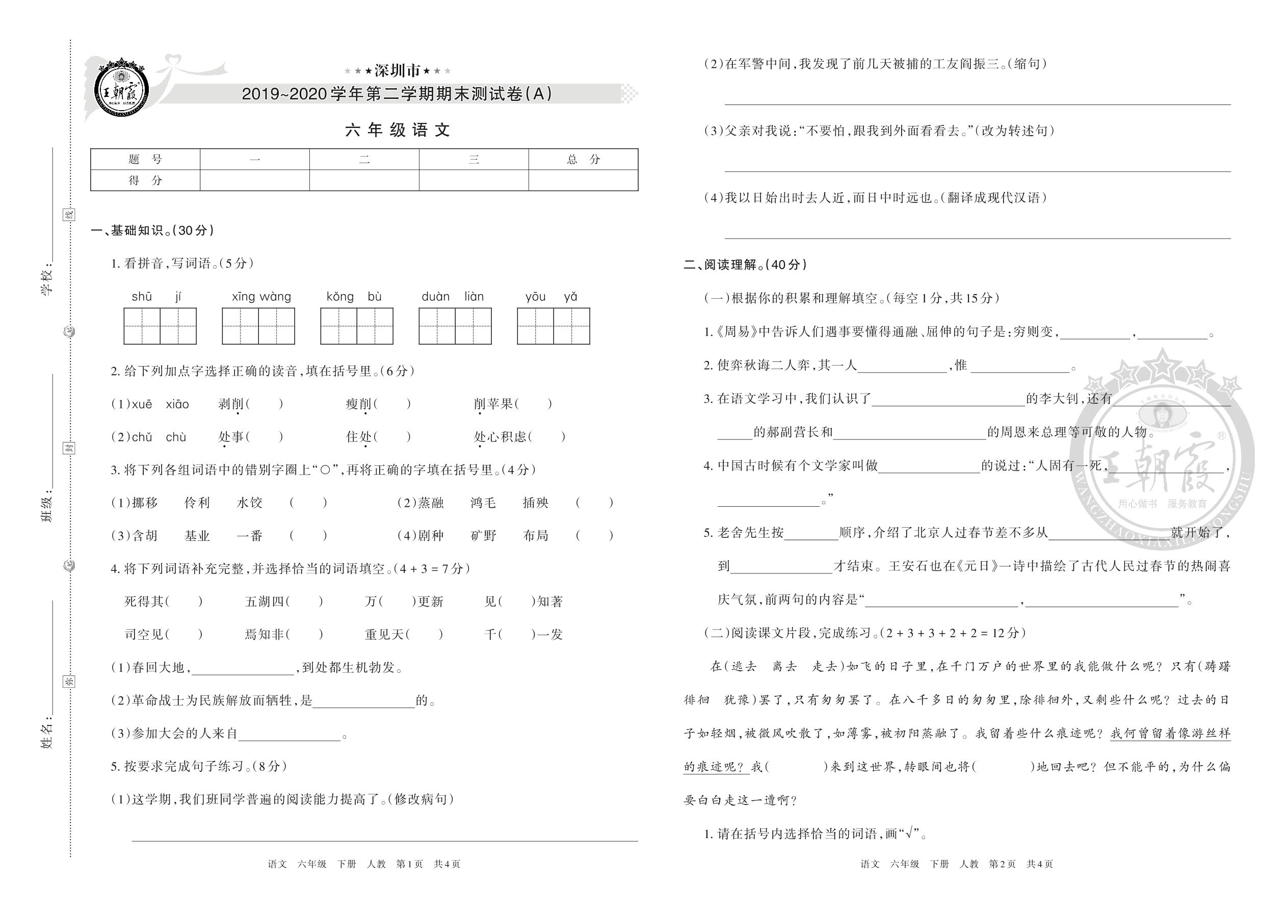 深圳市2019-2020学年第二学期期末测试卷(A)六年级语文(人教版)