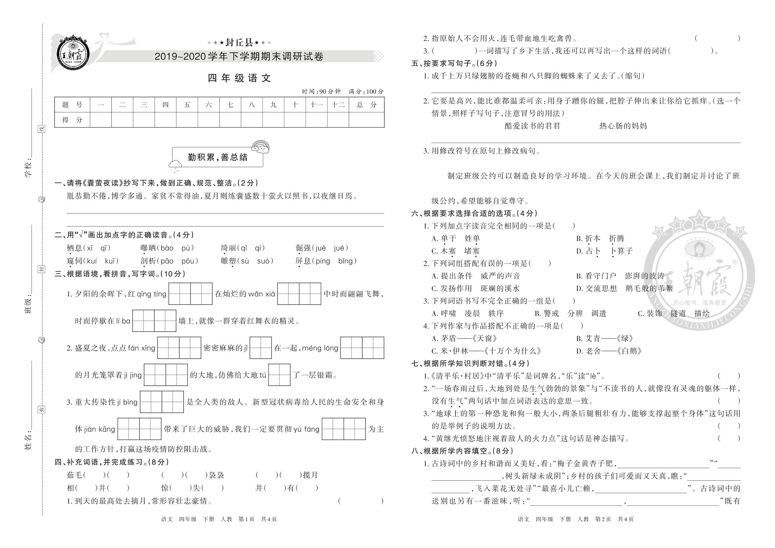 封丘县2019~2020学年下学期期末调研试卷四年级语文(人教版)