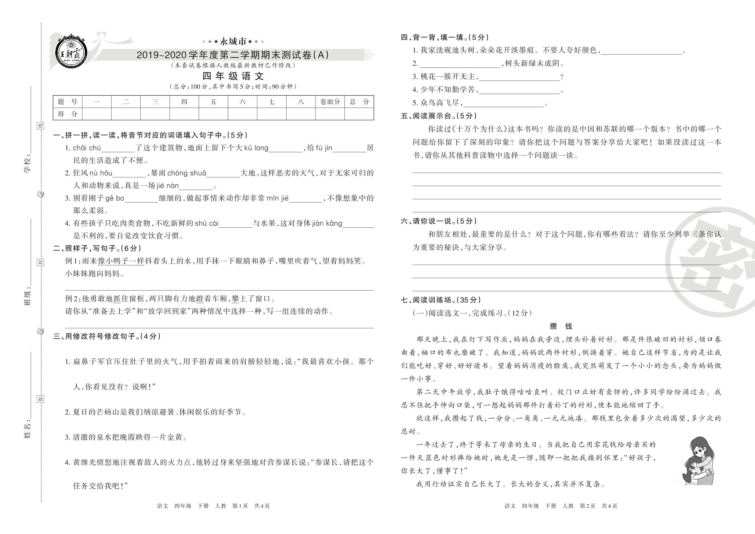 永城市2019~2020学年度第二学期期末测试卷(A)四年级语文(人教版)