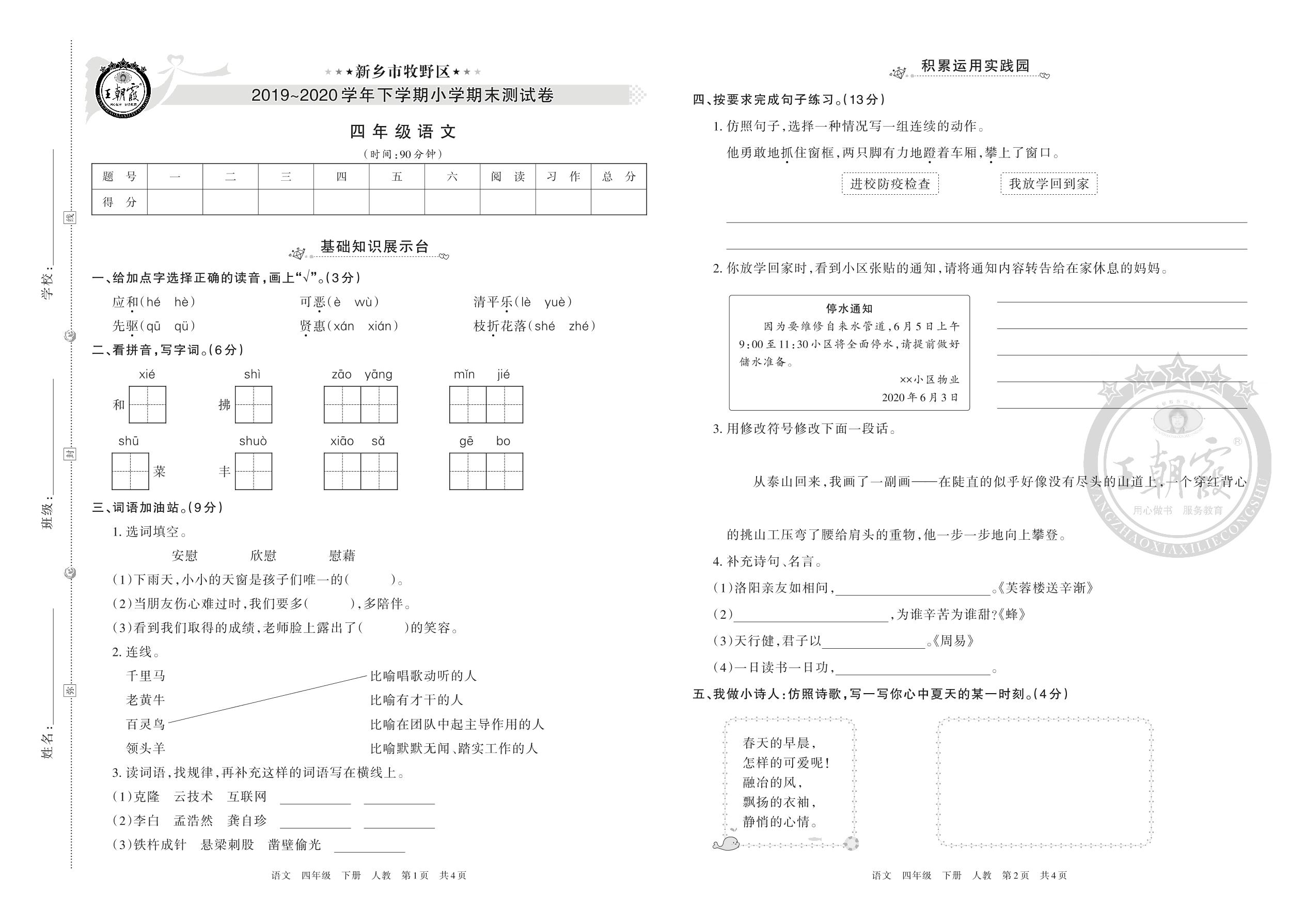 新乡市牧野区2019~2020学年下学期小学期末测试卷四年级语文(人教版)
