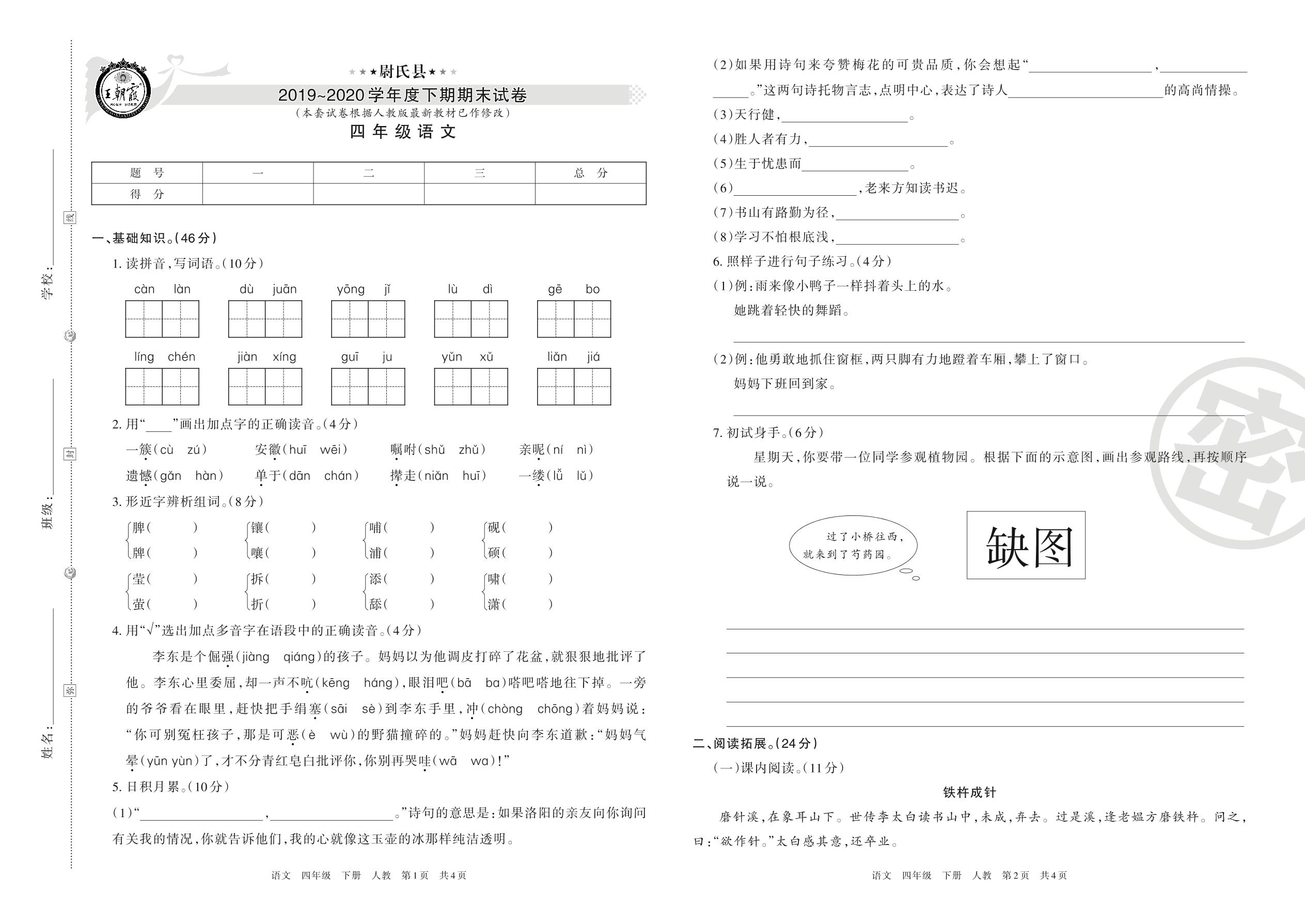 尉氏县2019~2020学年度下期期末试卷四年级语文(人教版)