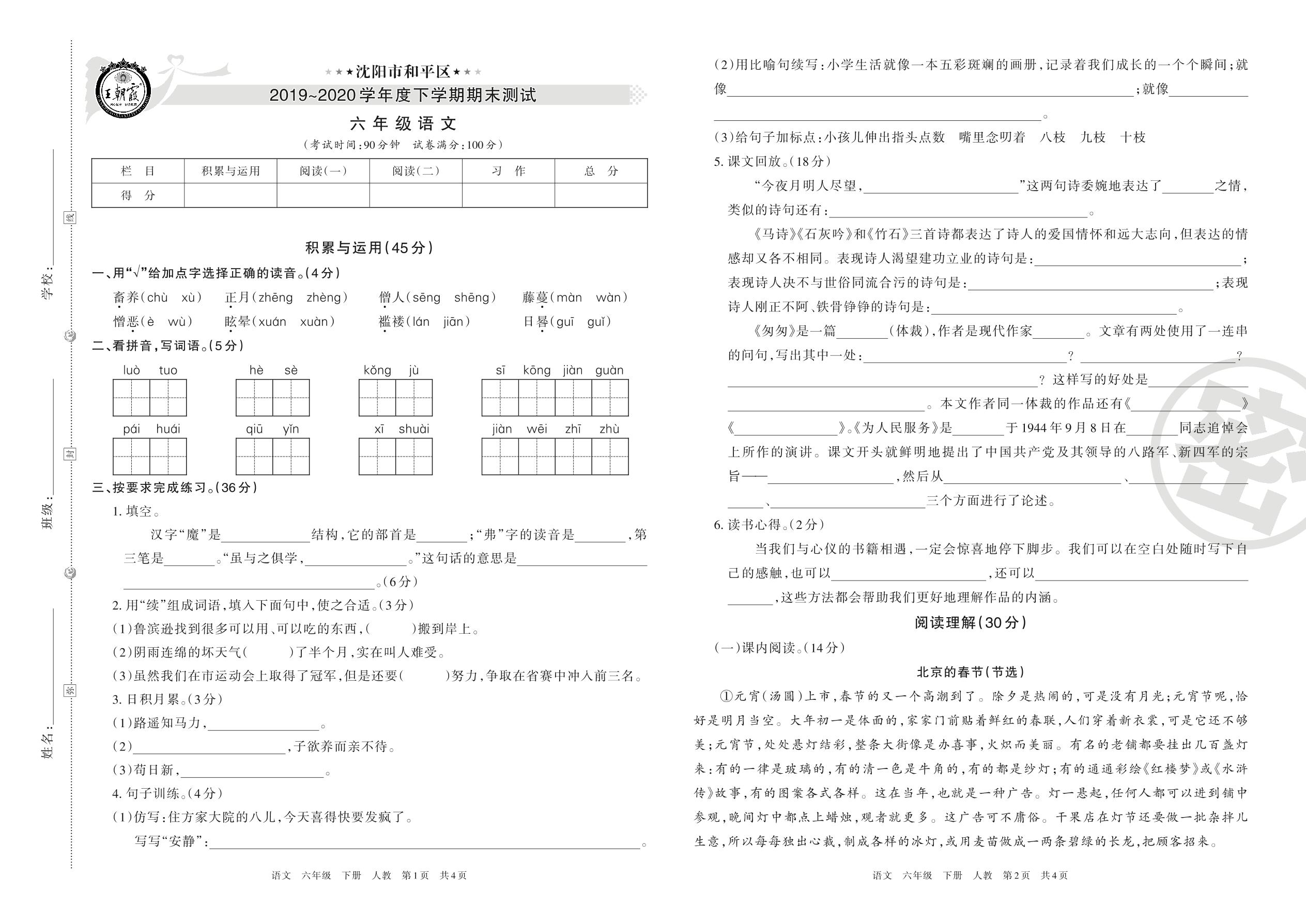 沈阳市和平区2019-2020学年度下学期期末测试六年级语文(人教版)