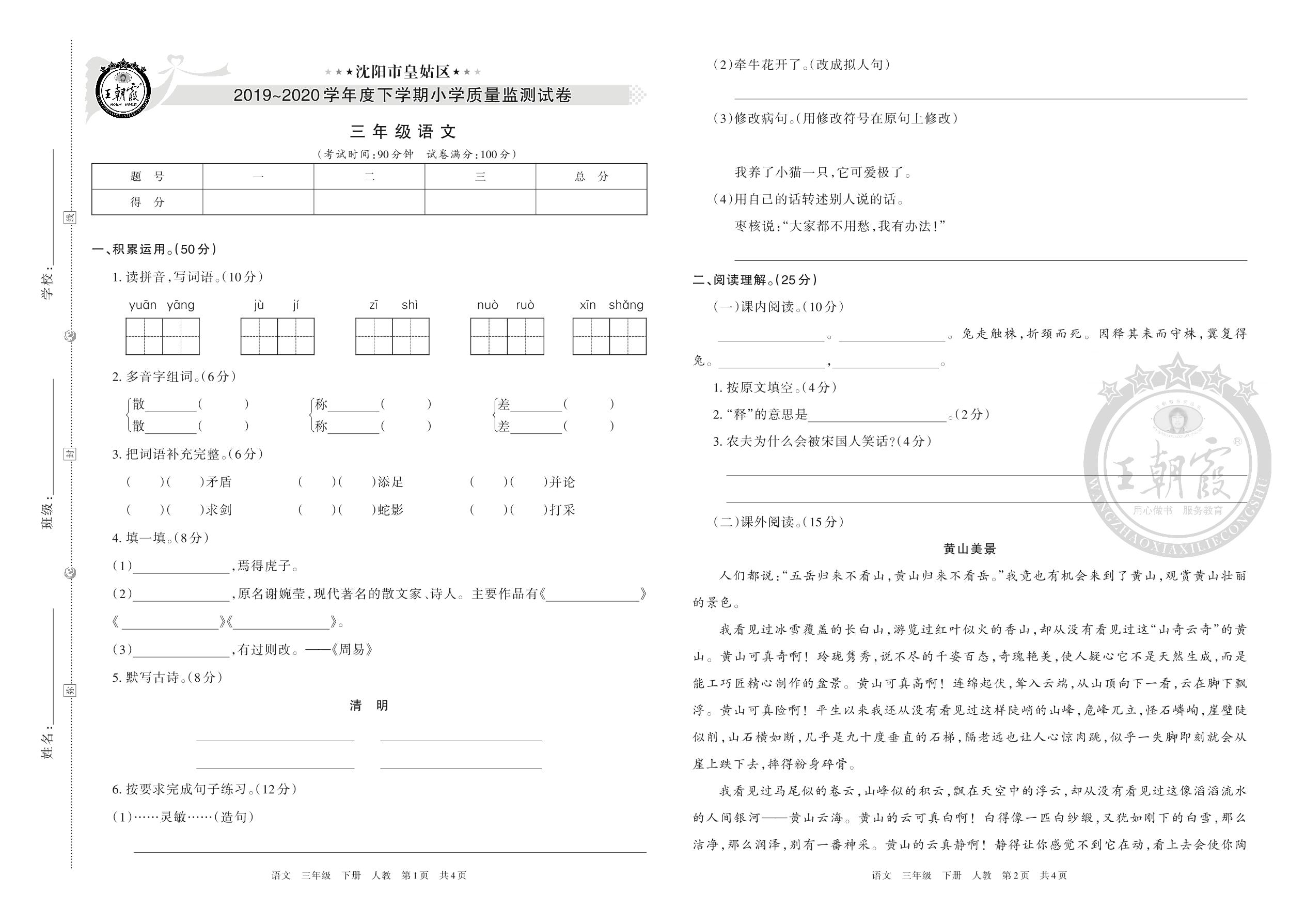 沈阳市皇姑区2019-2020学年度下学期小学质量监测试卷三年级语文(人教版)