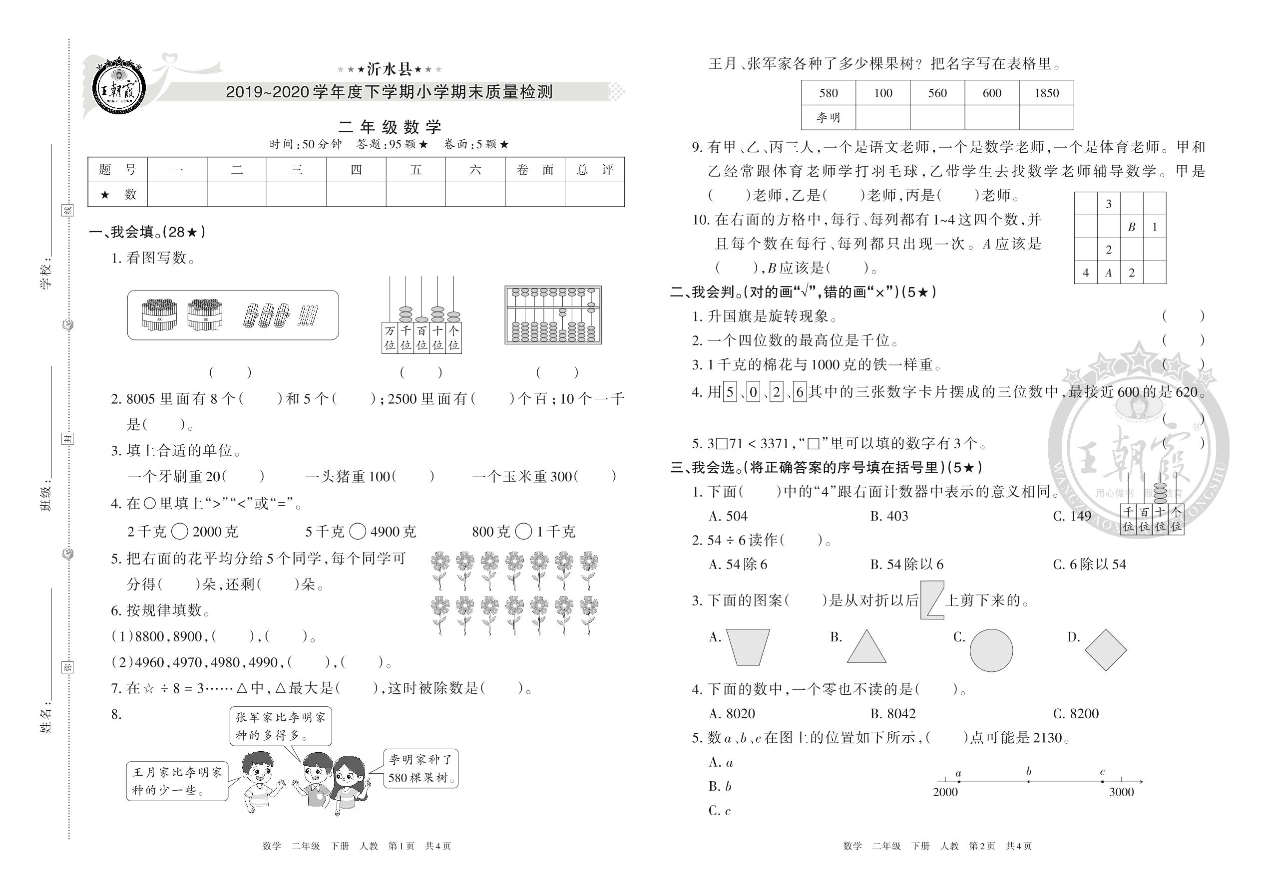 沂水县2019~2020学年度下学期小学期末质量检测二年级数学(人教版)