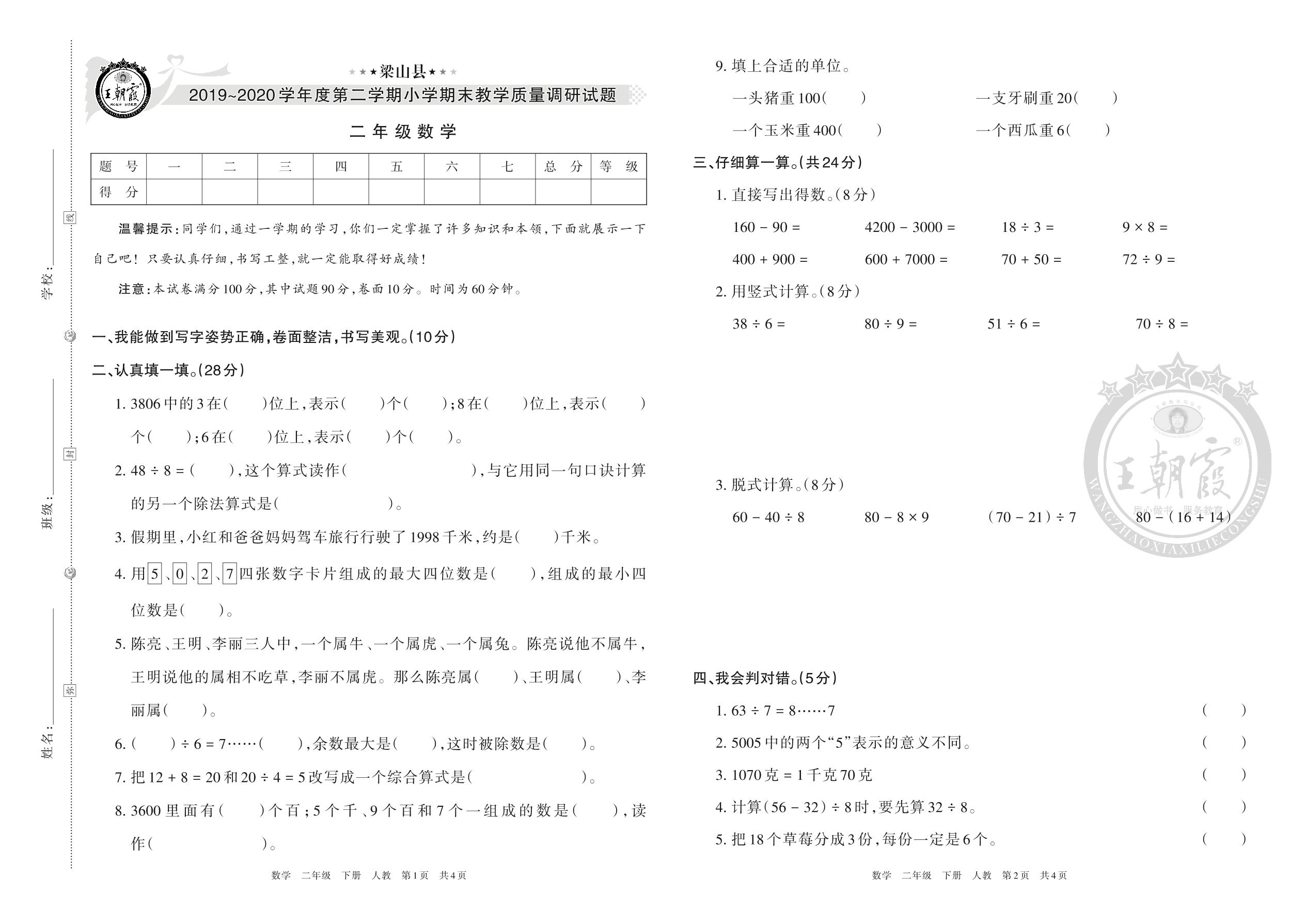 梁山县2019~2020学年度第二学期小学期末教学质量调研试题二年级数学(人教版)