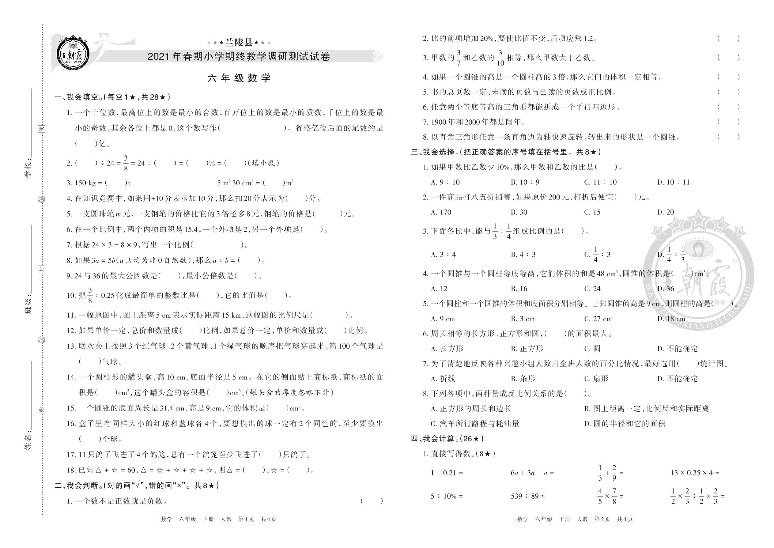 兰陵县2021年春期小学期终教学调研测试试卷六年级数学(人教版)
