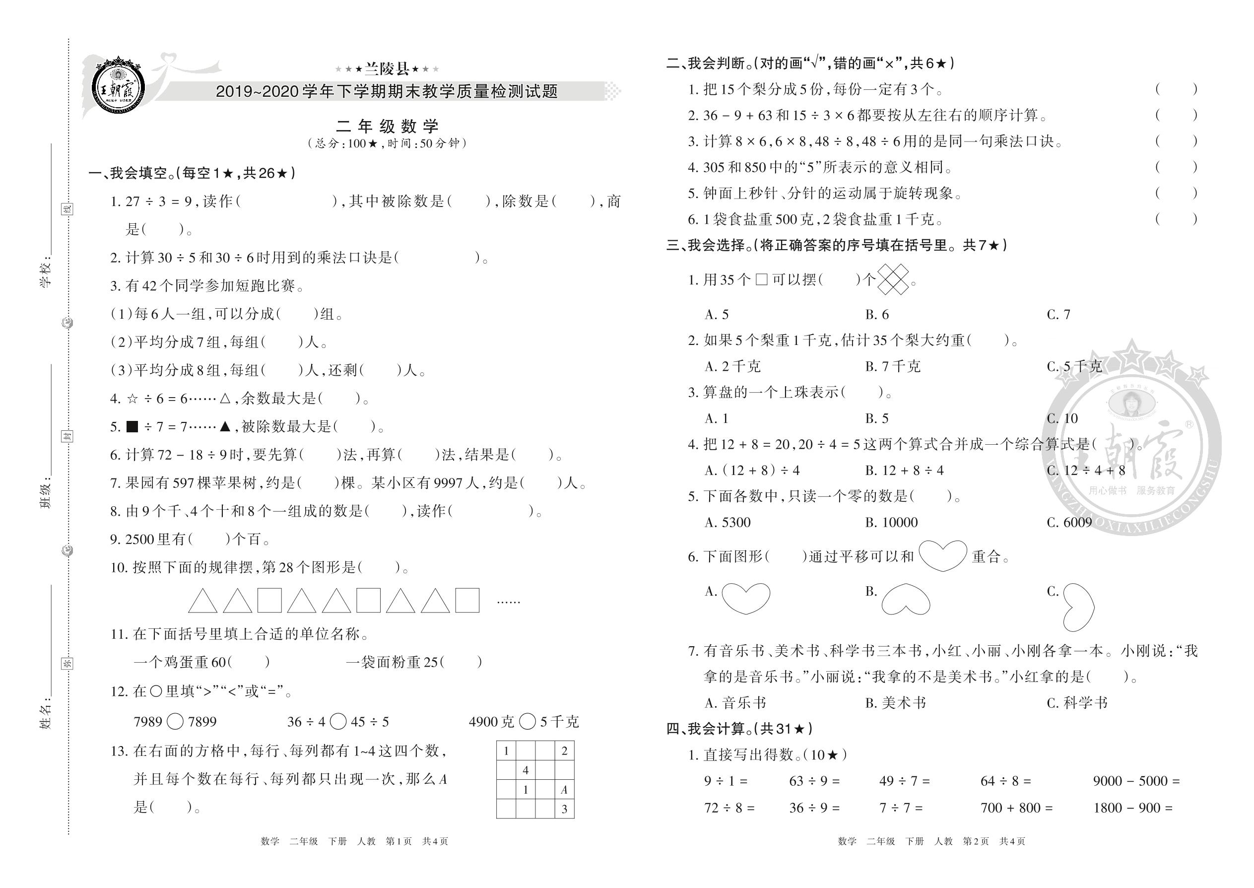 兰陵县2019~2020学年下学期期末教学质量检测试题二年级数学(人教版)