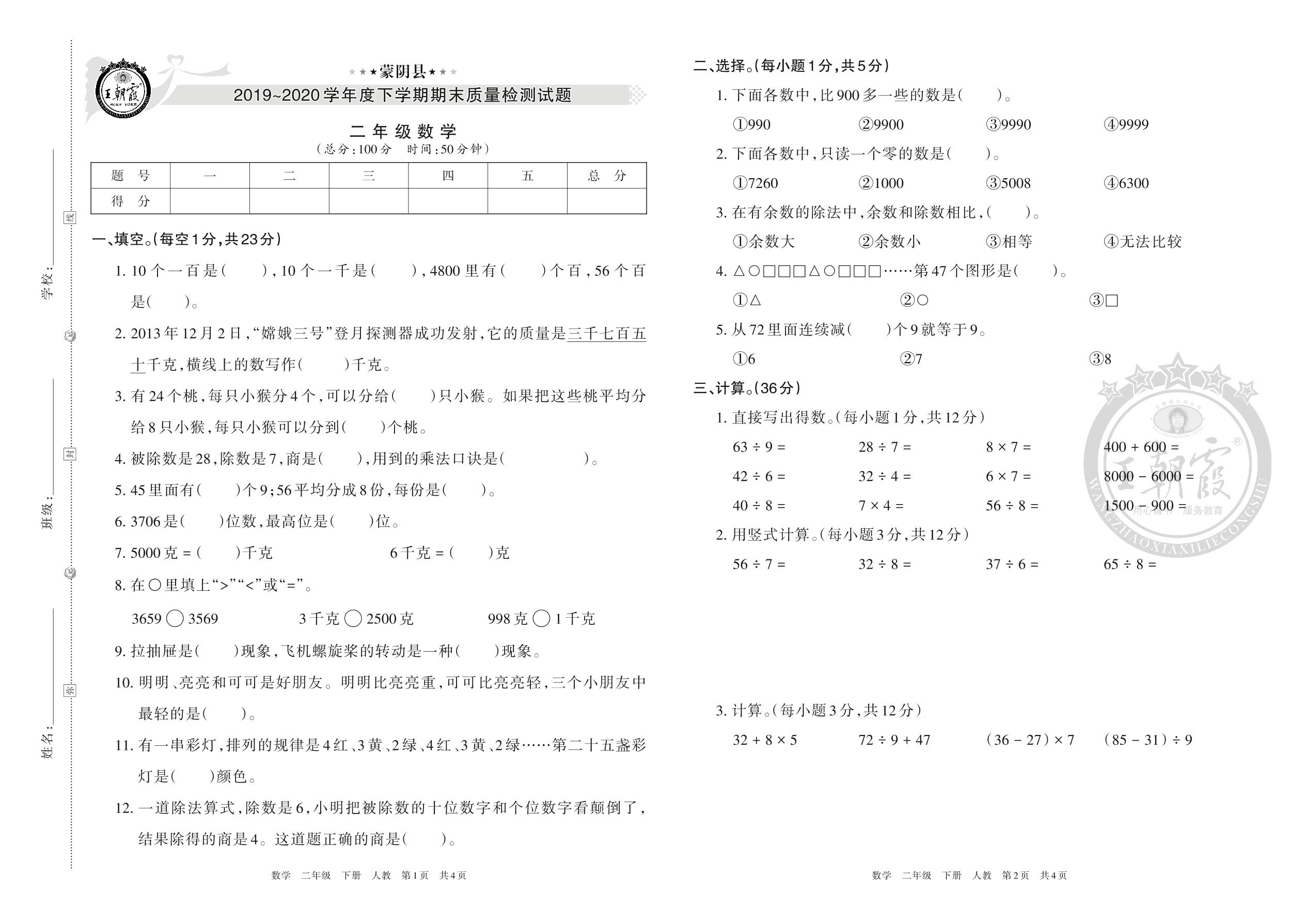 蒙阴县2019~2020学年度下学期期末质量检测试题二年级数学(人教版)