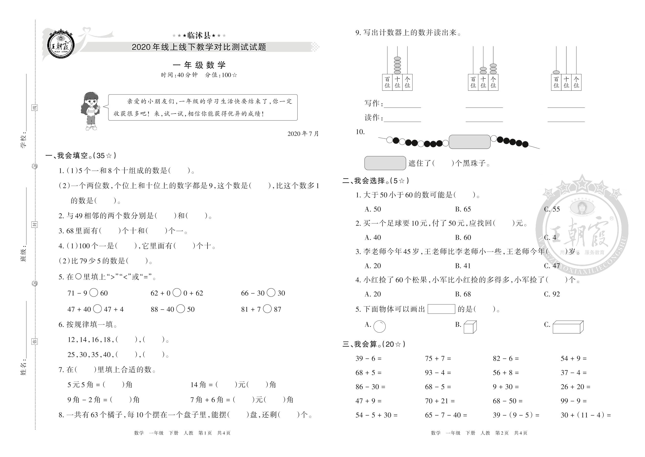 临沭县2020年线上线下教学对比测试试题一年级数学(人教版)