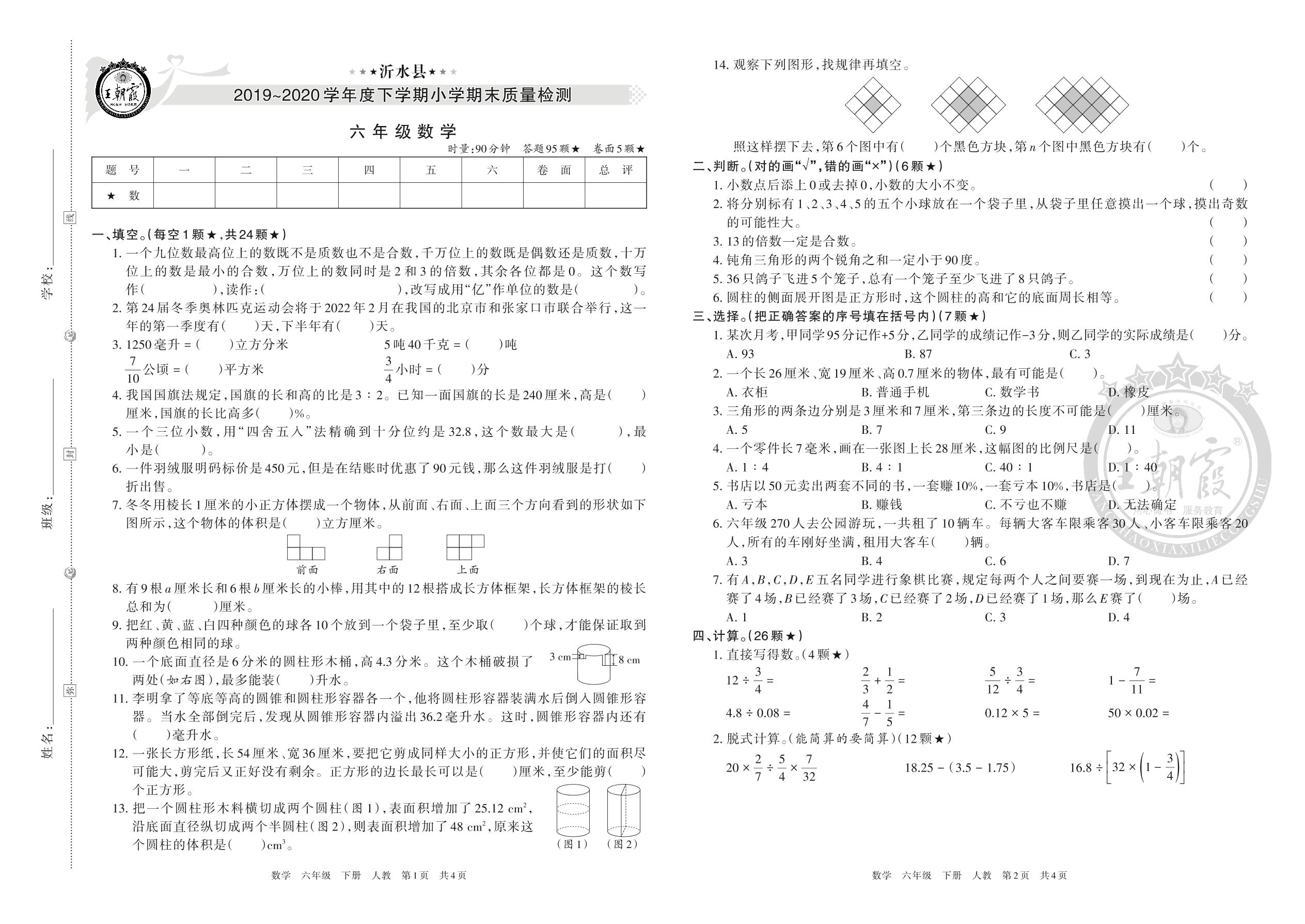 沂水县2019~2020学年度下学期期末质量检测六年级数学(人教版)