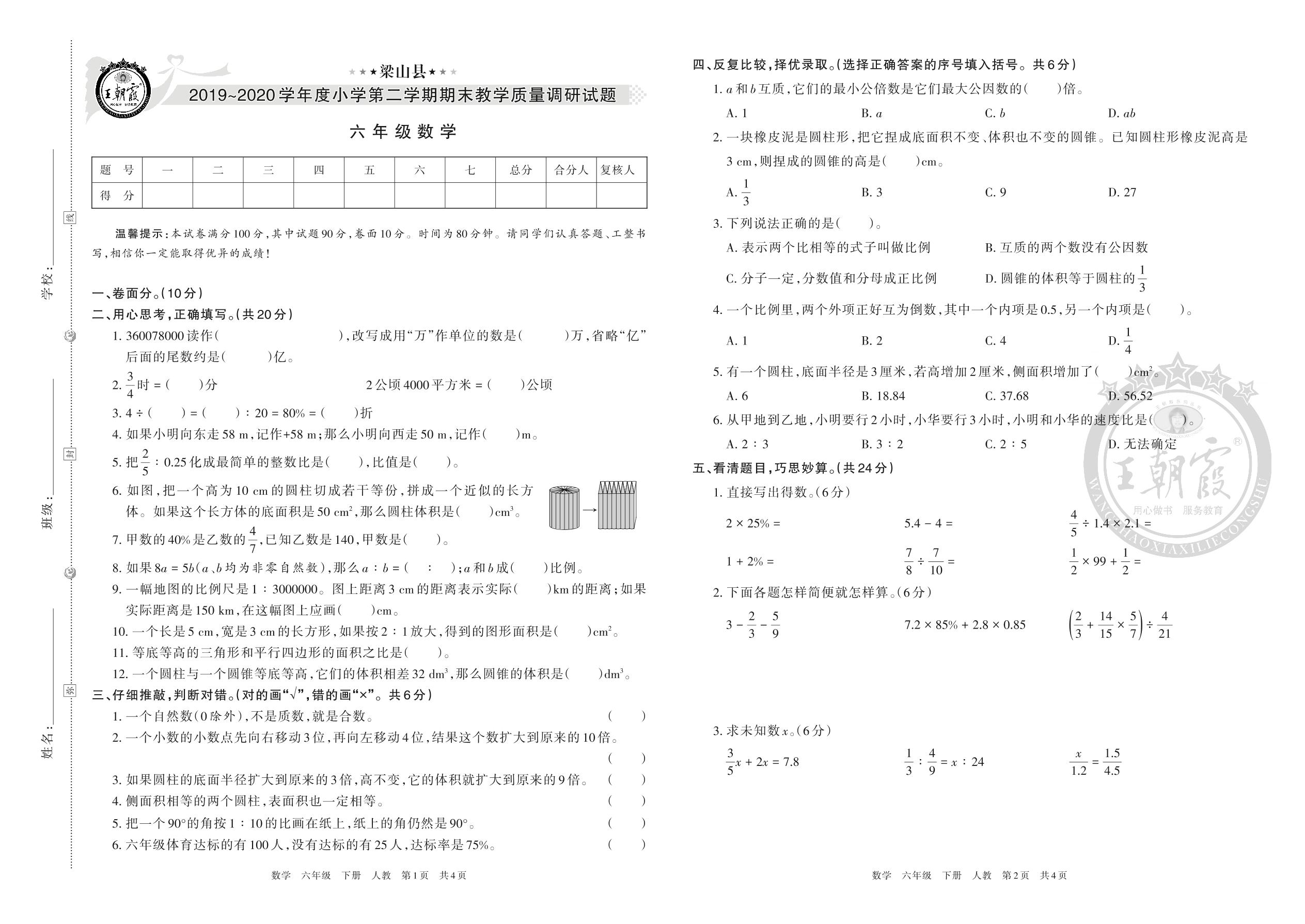 梁山县2019~2020学年度小学第二学期期末教学质量调研试题六年级数学(人教版)