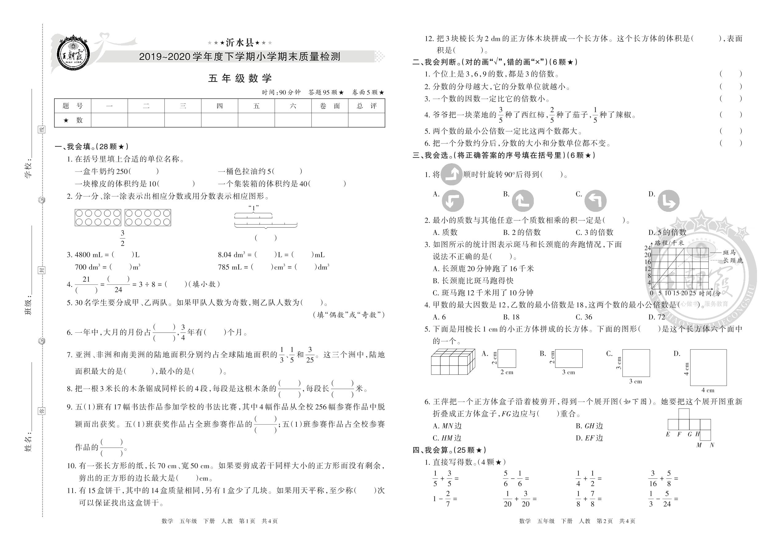 沂水县2019~2020学年度下学期小学期末质量检测五年级数学(人教版)