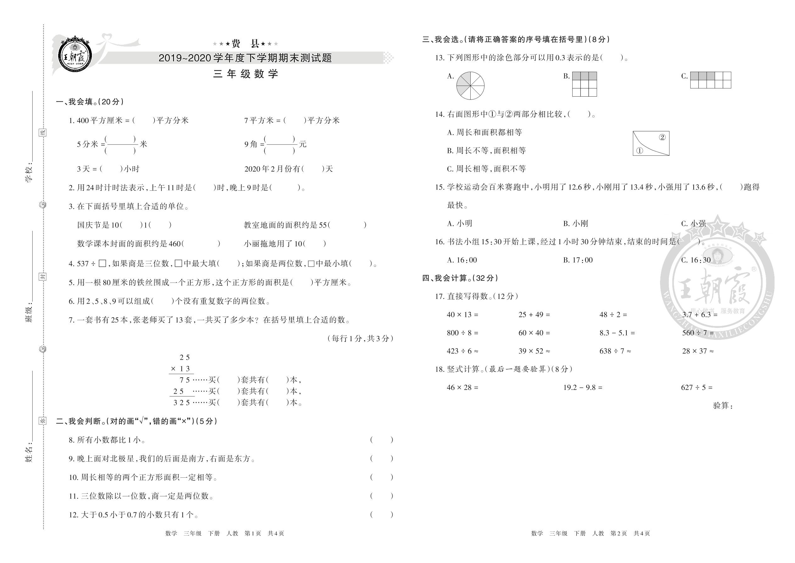 费县2019~2020学年度下学期期末测试题三年级数学(人教版)
