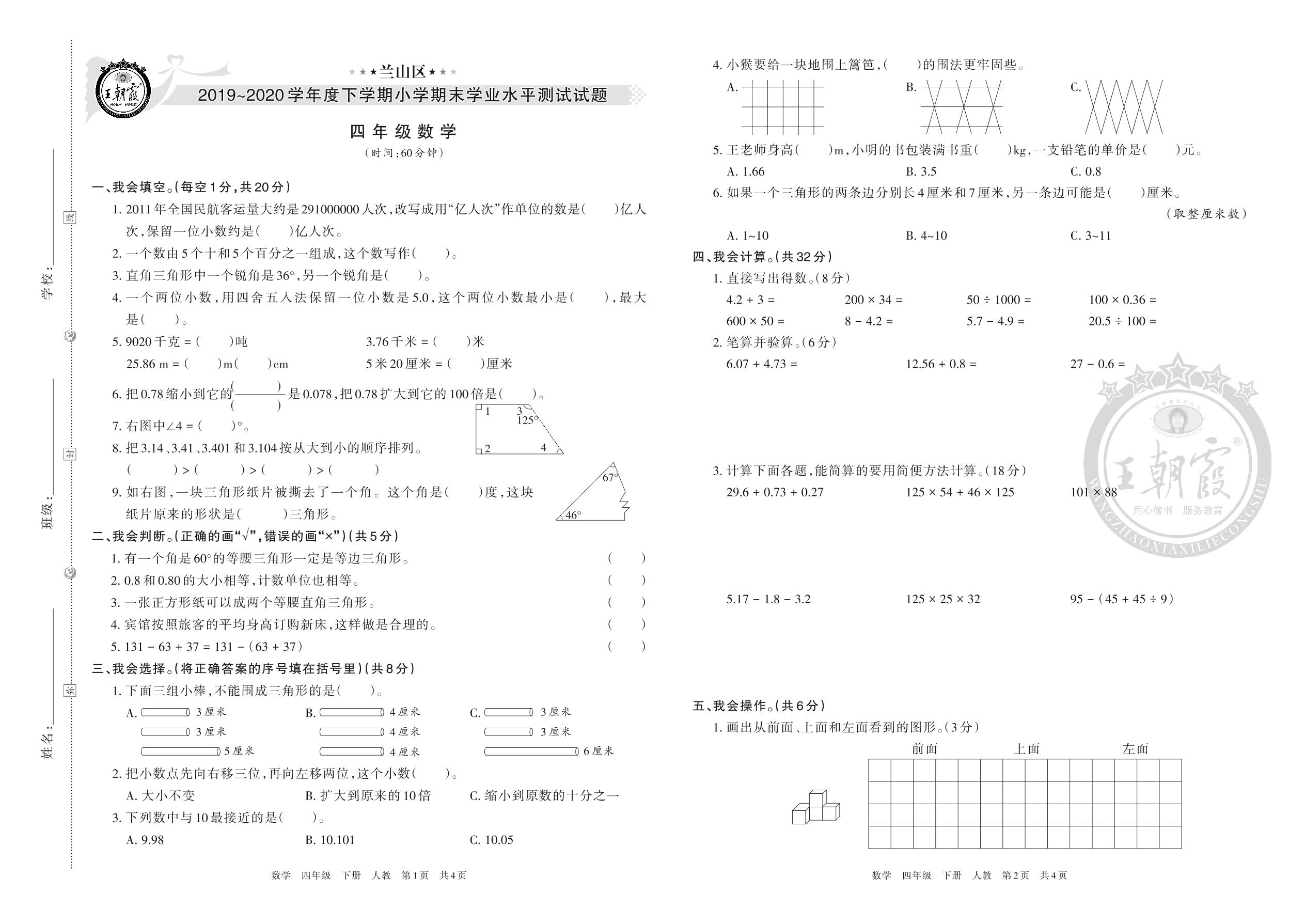 兰山区2019~2020学年度下学期小学期末学业水平测试试题四年级数学(人教版)