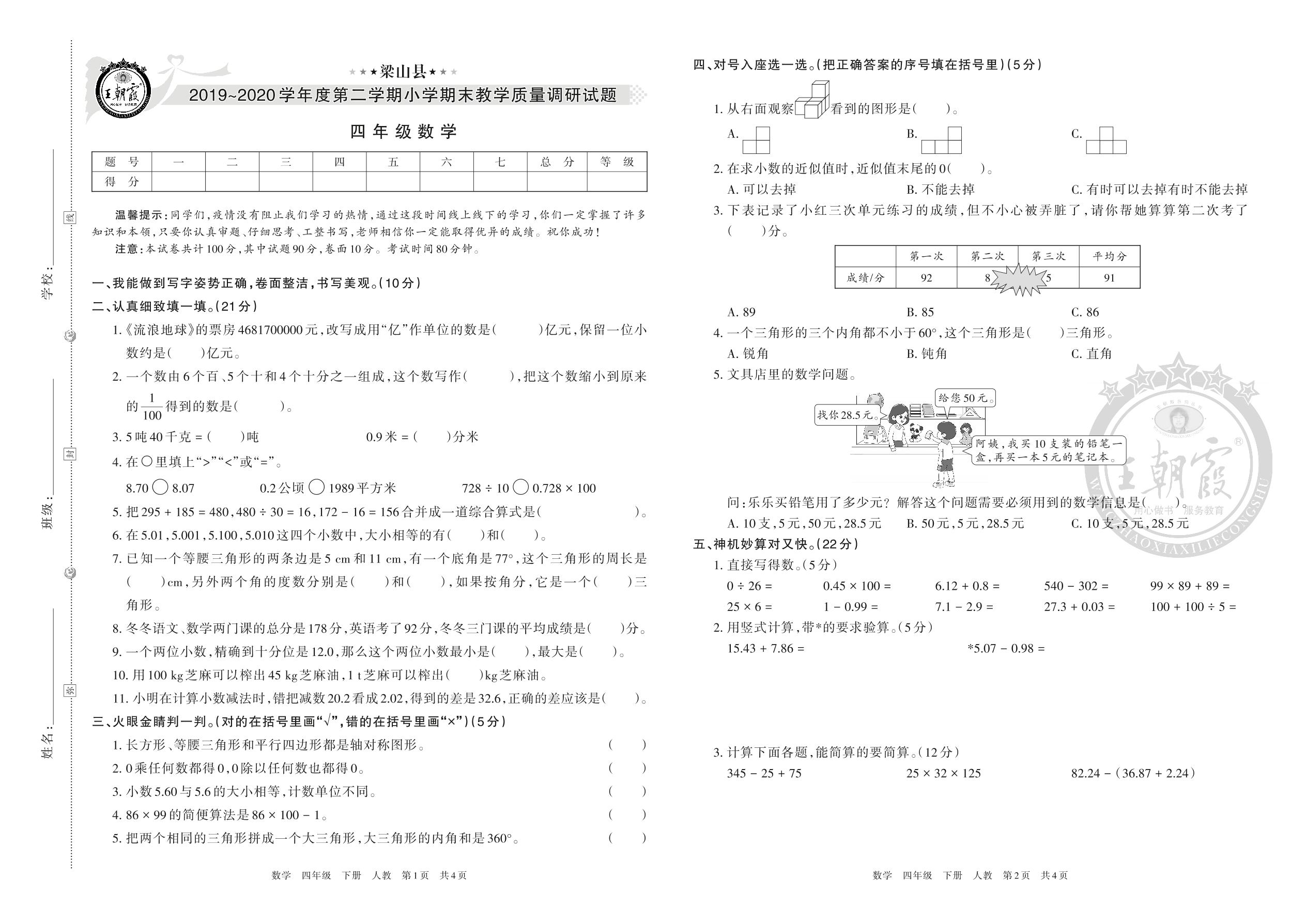 梁山县2019~2020学年度第二学期小学期末教学质量调研试题四年级数学(人教版)
