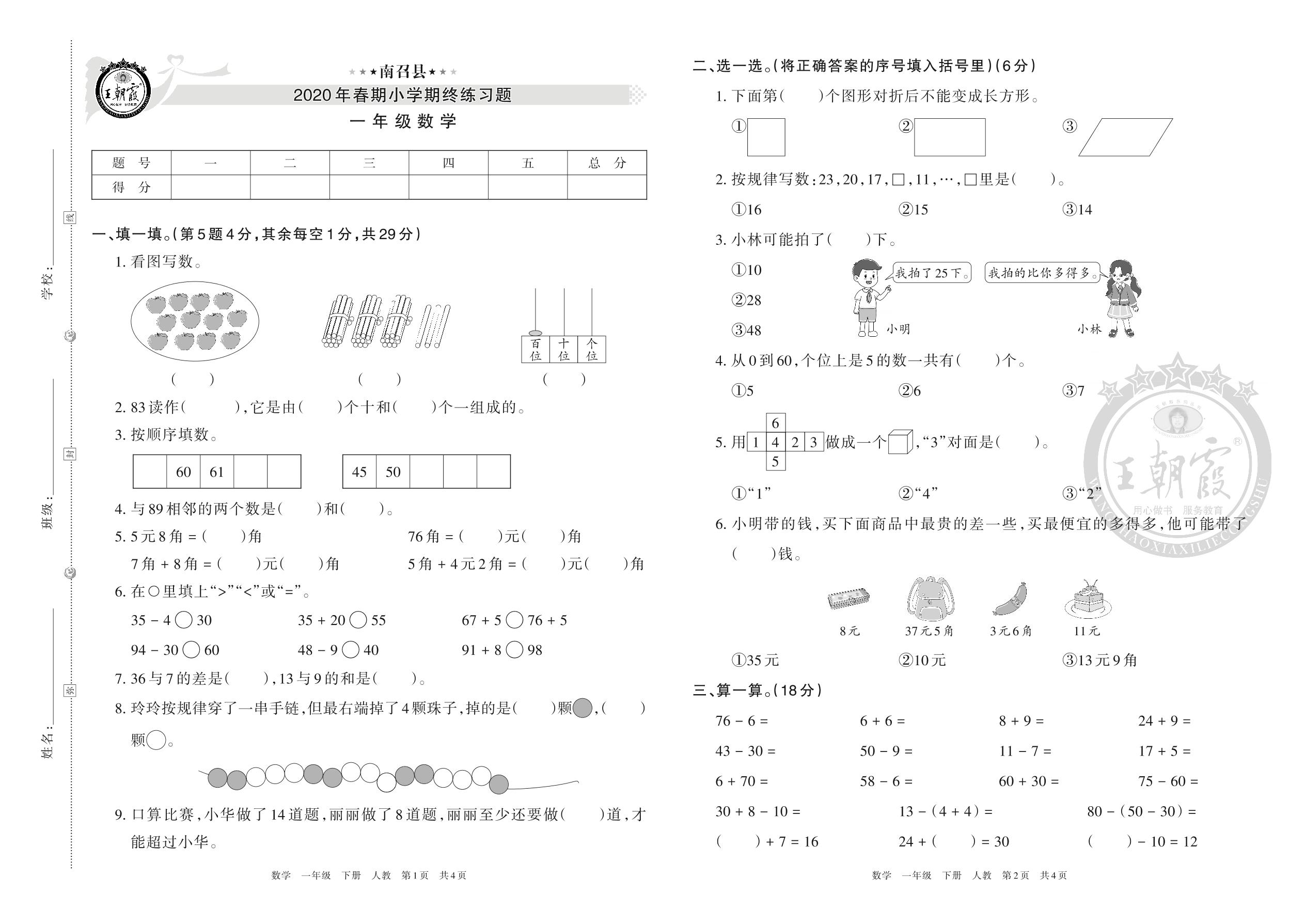 南召县2020年春期小学期终练习题一年级数学(人教版)
