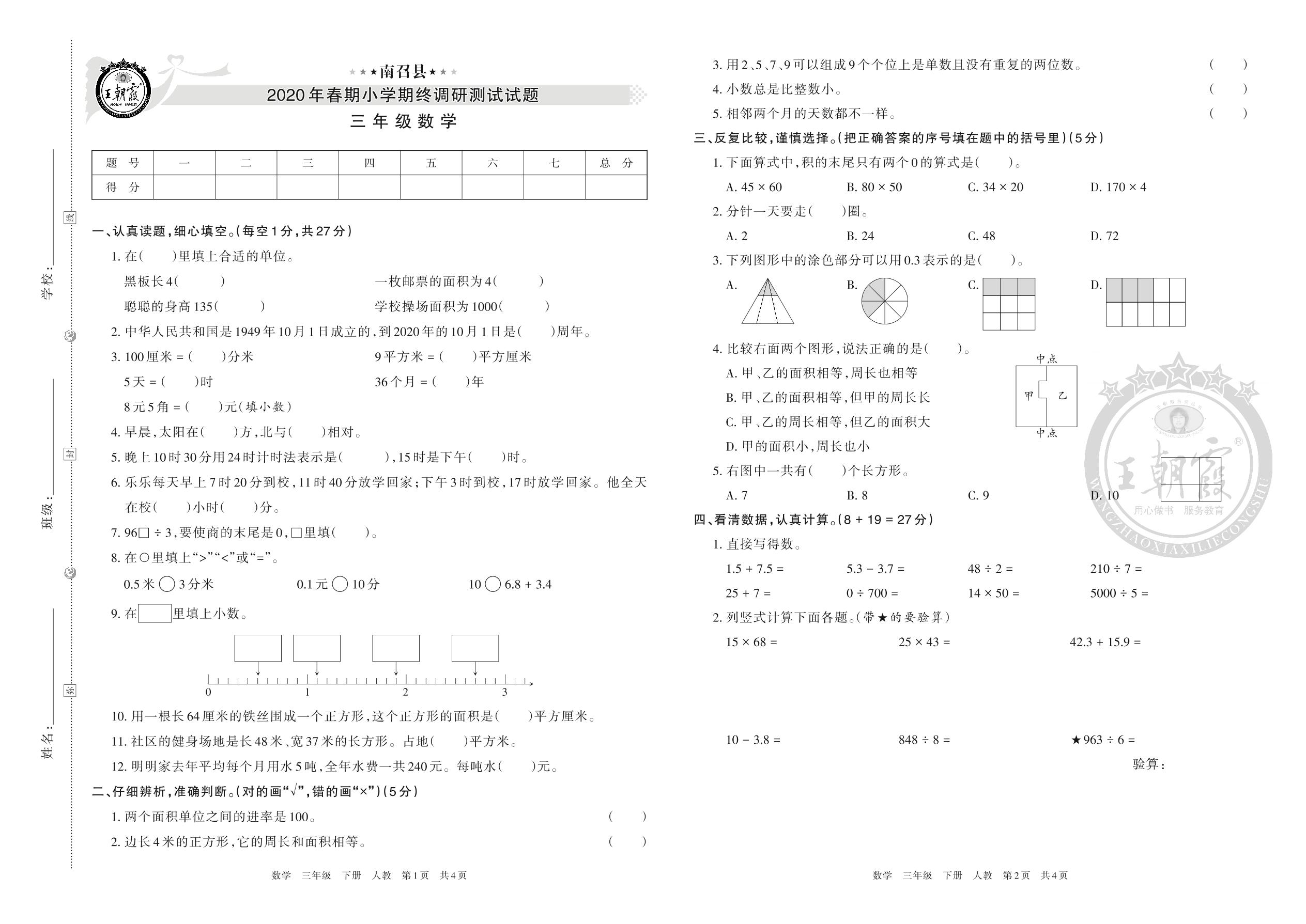 南召县2020年春期小学期终调研测试试题三年级数学(人教版)