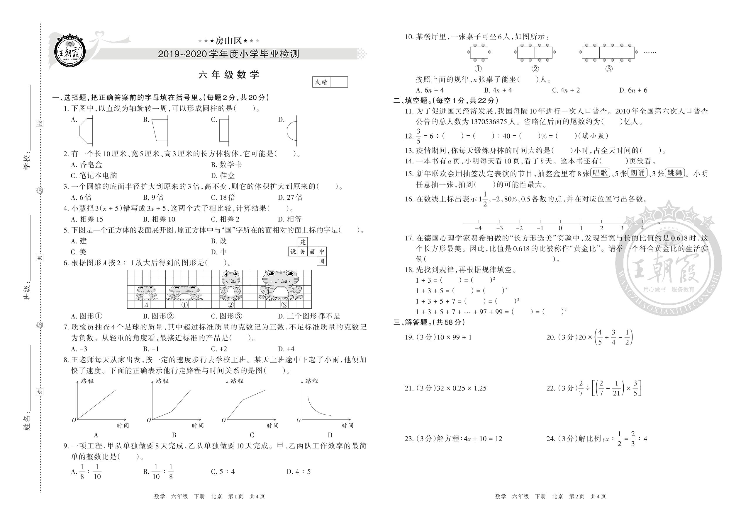 房山区2019~2020学年度小学毕业检测六年级数学(北京版)