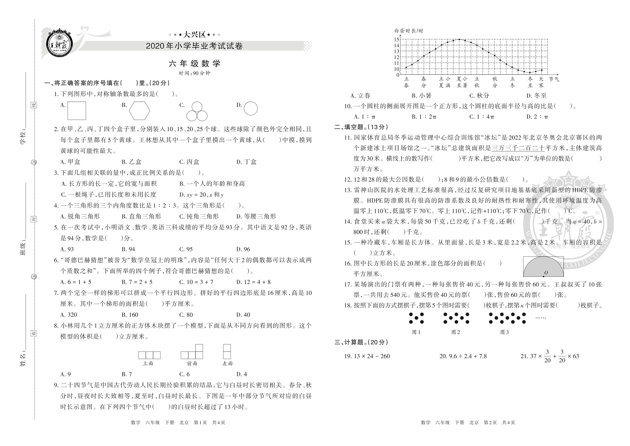 大兴区2020年小学毕业考试试卷六年级数学(北京版)