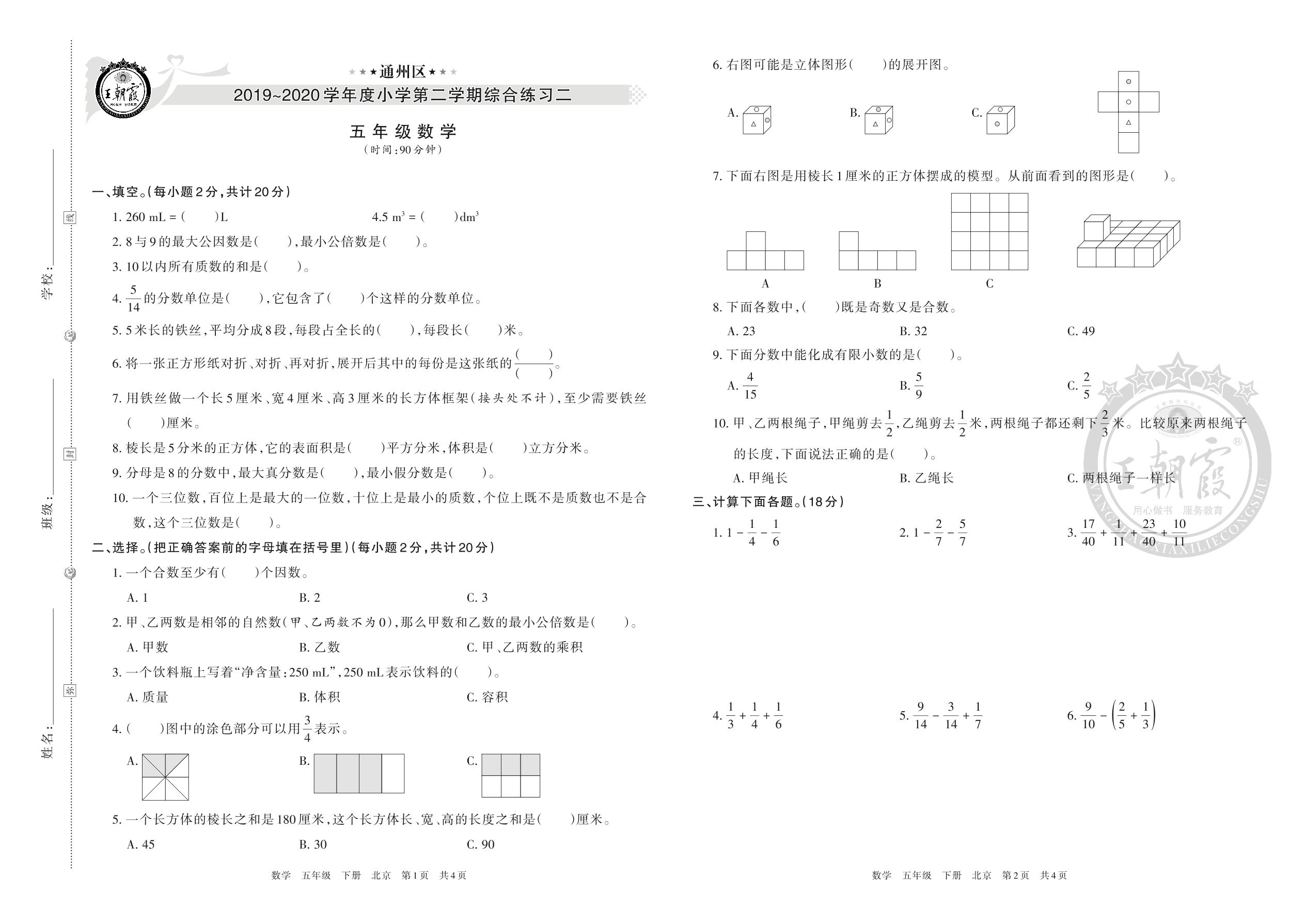 通州区2019~2020学年度小学第二学期综合练习二五年级数学(北京版)