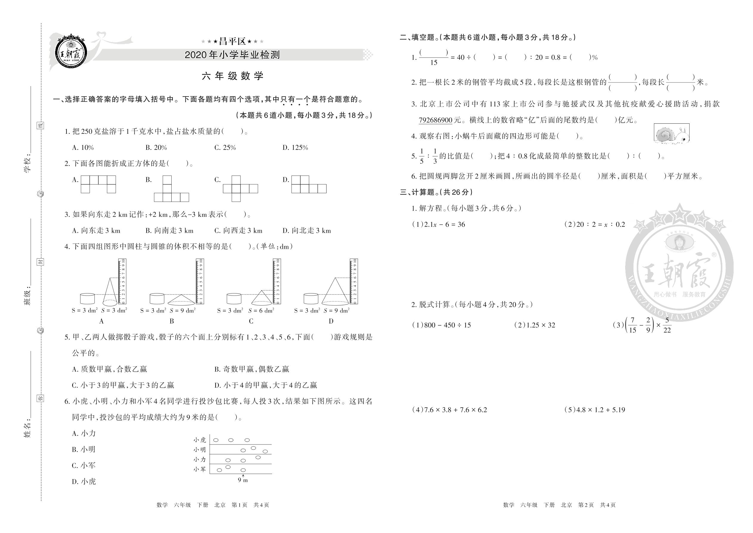 昌平区2020年小学毕业检测六年级数学(北京版)