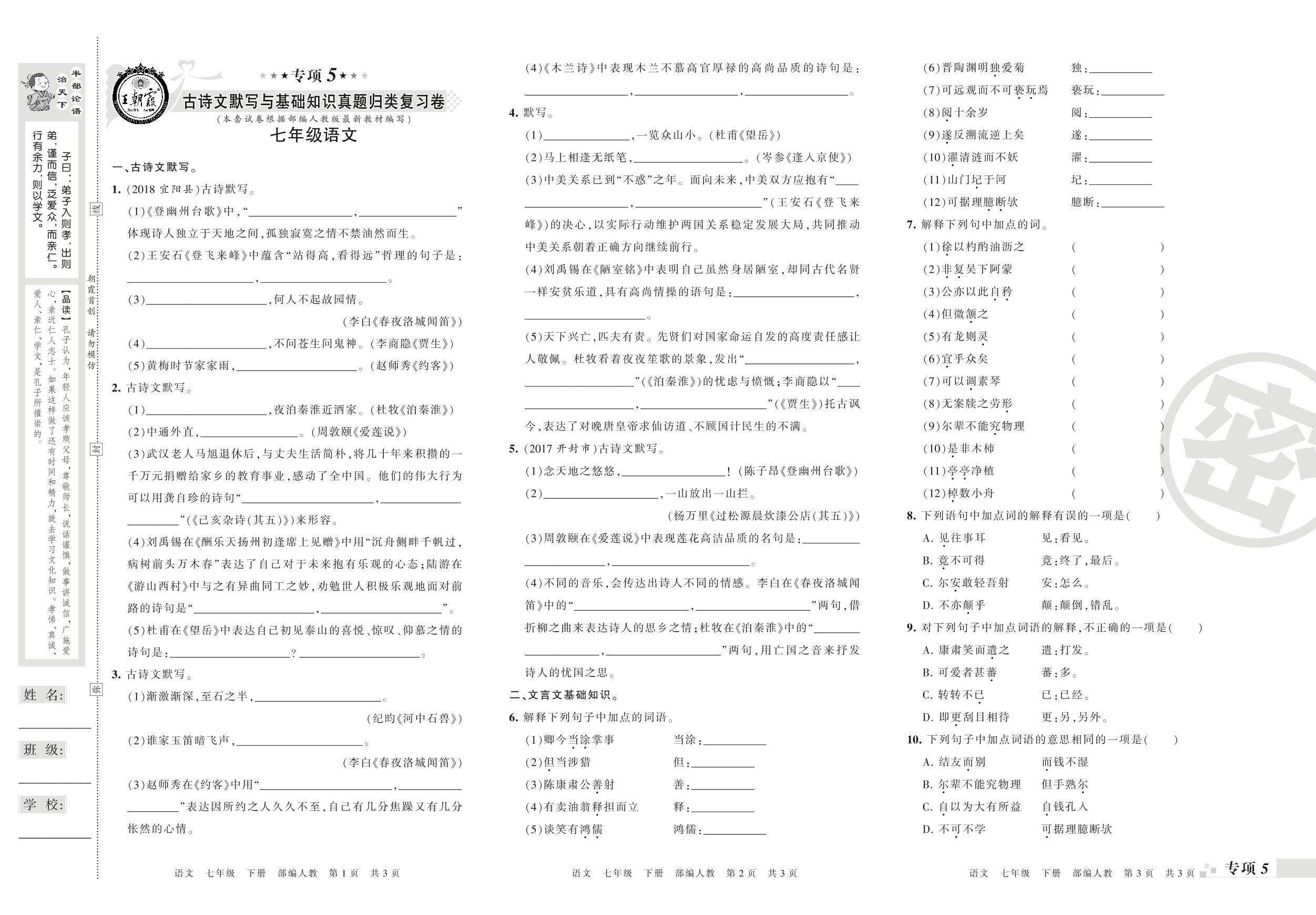 王朝霞期末专项卷——古诗文默写与基础知识、课内文言文阅读真题归类复习卷七年级下册语文(人教版)_R21080230026【0】