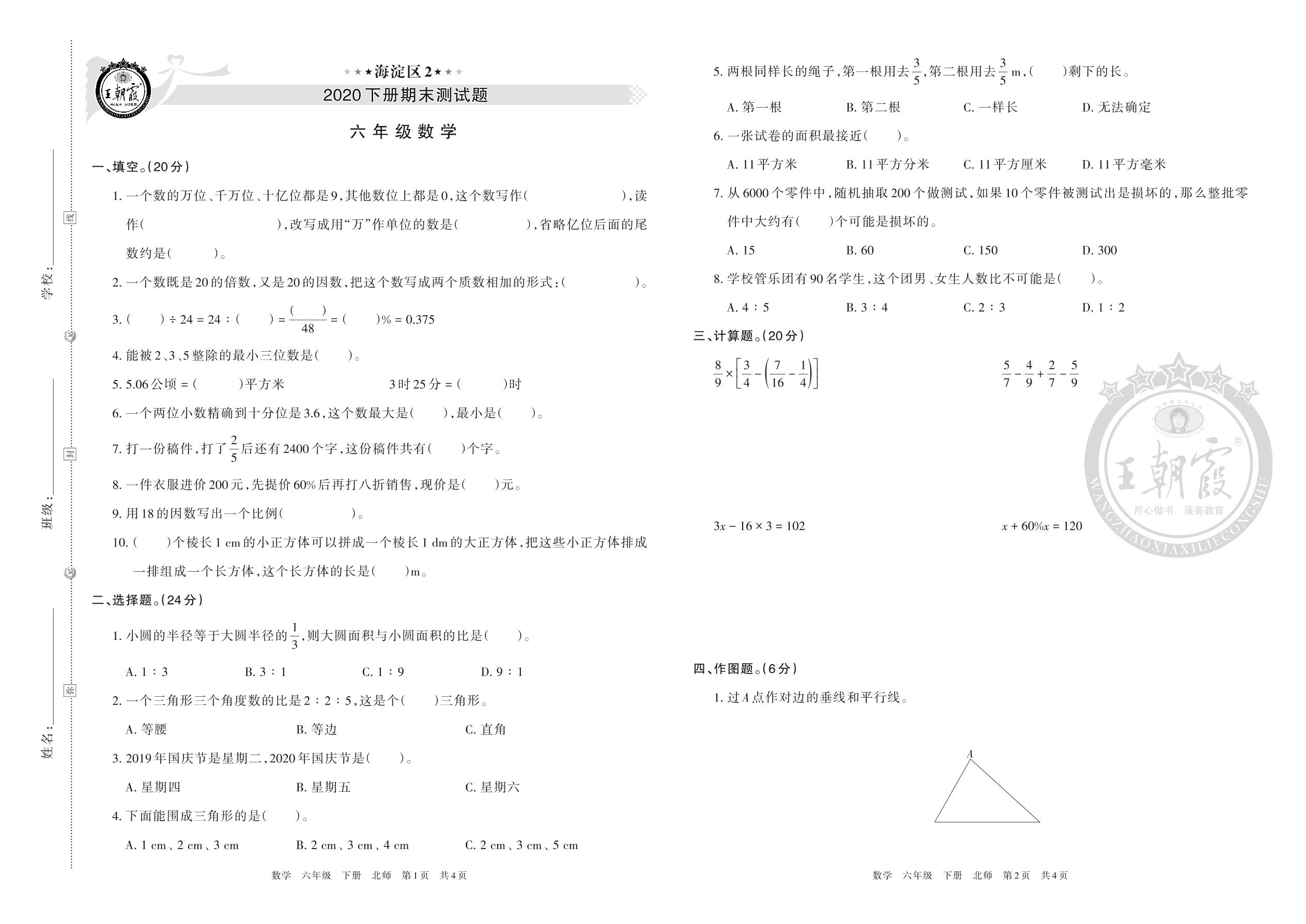 海淀区2 2020下册期末测试题六年级数学(北师版)