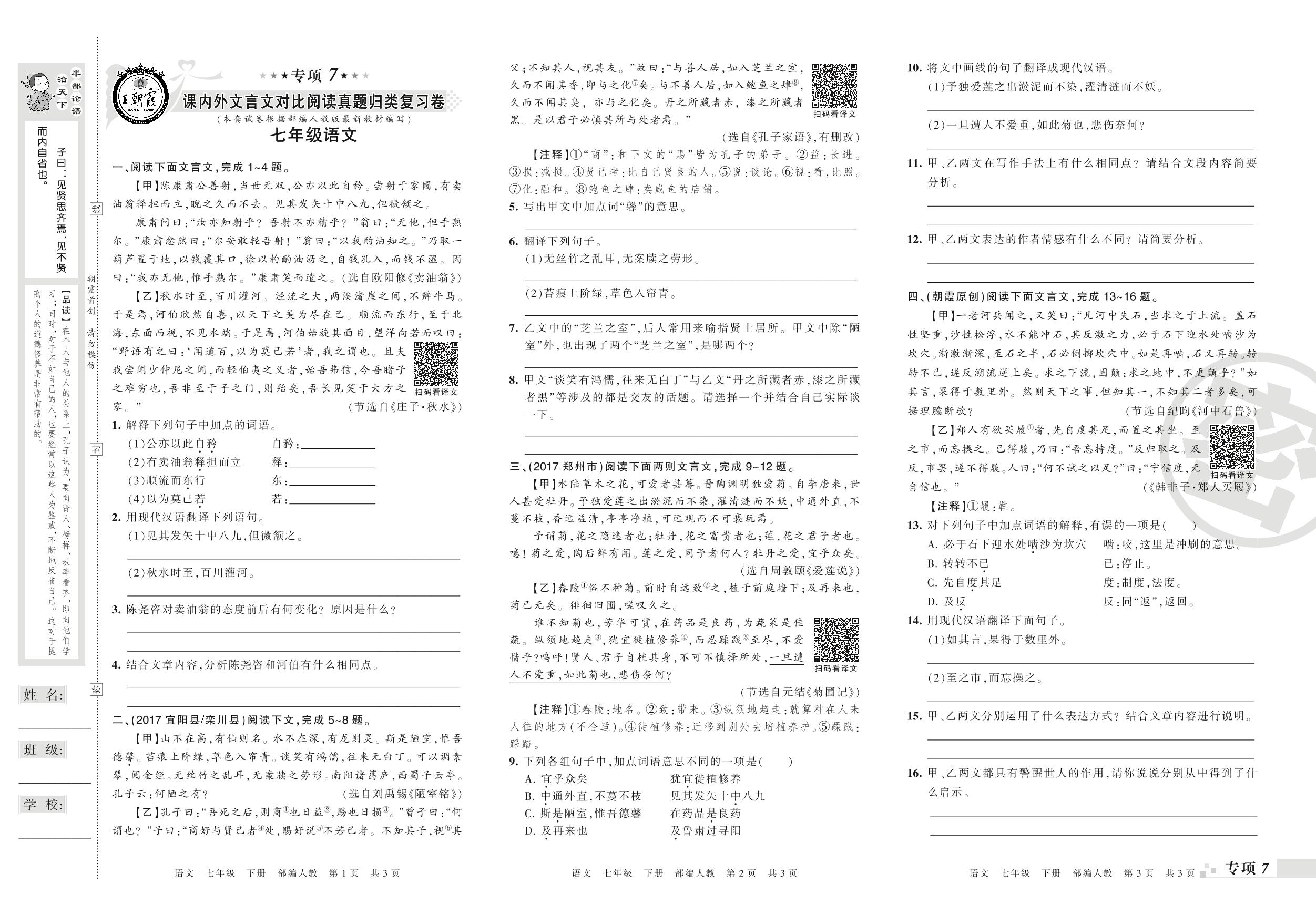 王朝霞期末专项卷——课内外文言文对比阅读、古诗词阅读真题归类复习卷七年级下册语文(人教版)_R21080230033【0】