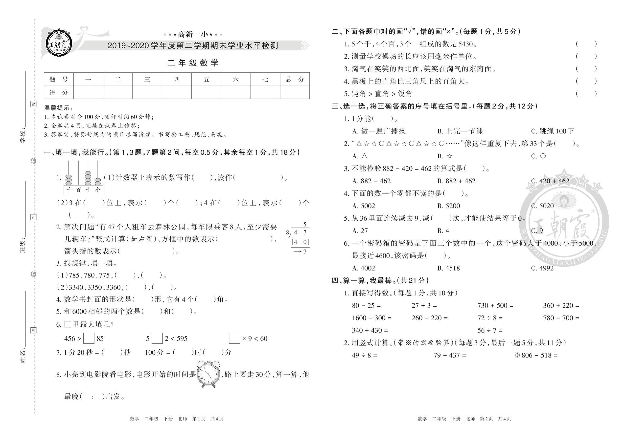 西安市高新一小2019~2020学年度第二学期期学业水平测试二年级数学(北师版)