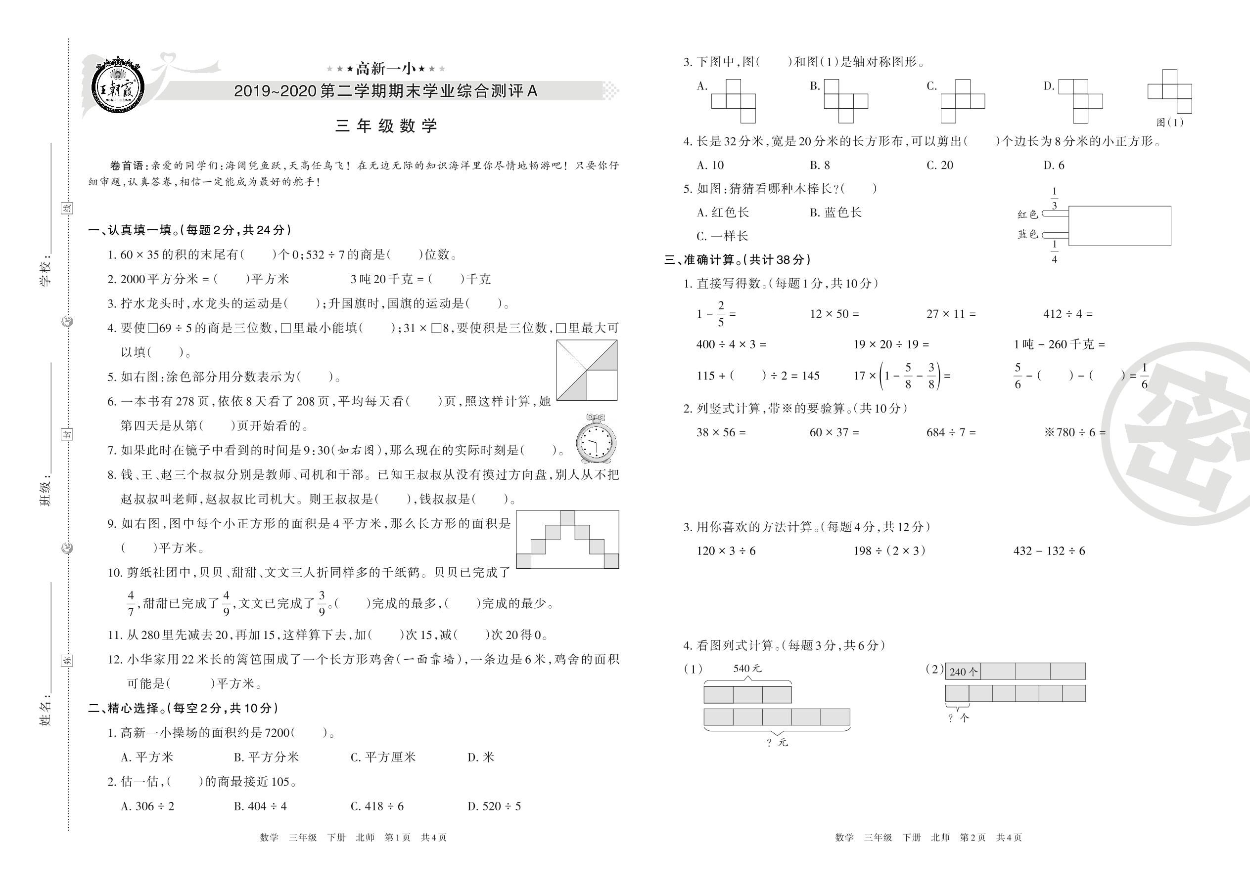 西安市高新一小2019~2020第二学期期末学业综合测评A三年级数学(北师版)