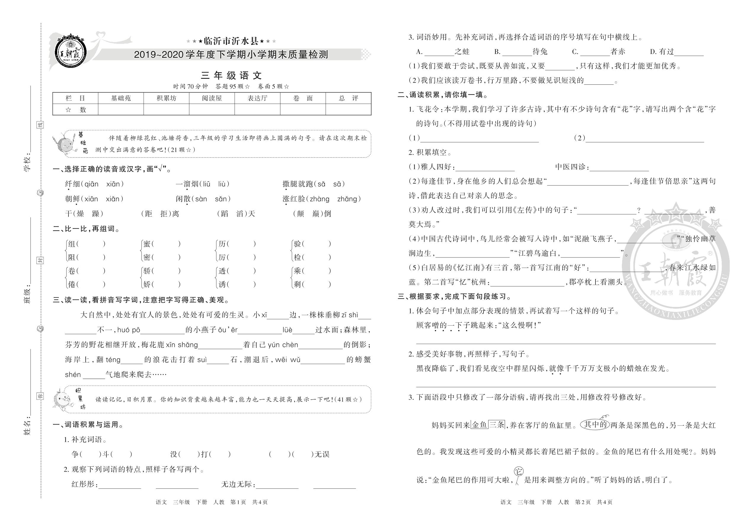临沂市沂水县2019~2020学年度下学期小学期末质量检测三年级语文(人教版)