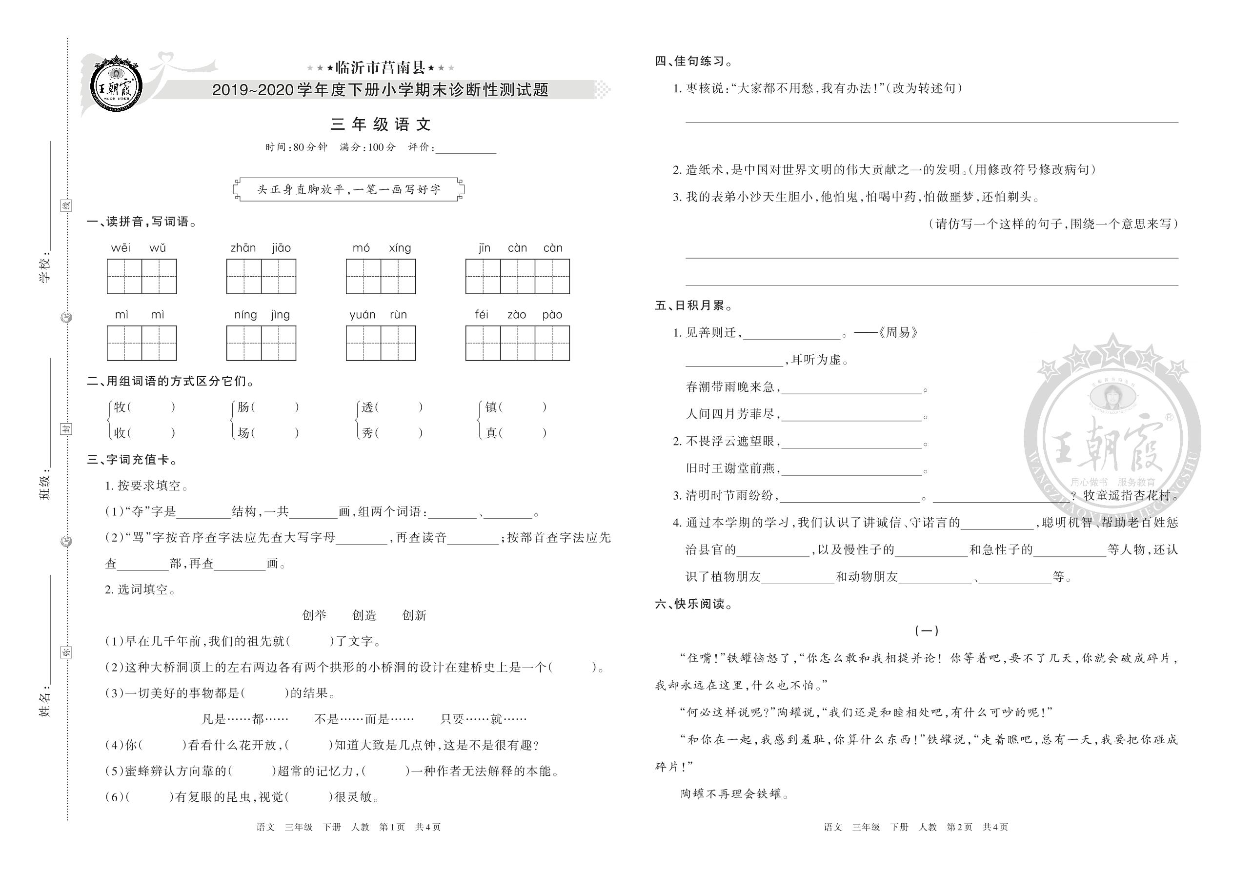 三年级语文人教版下册期末卷
