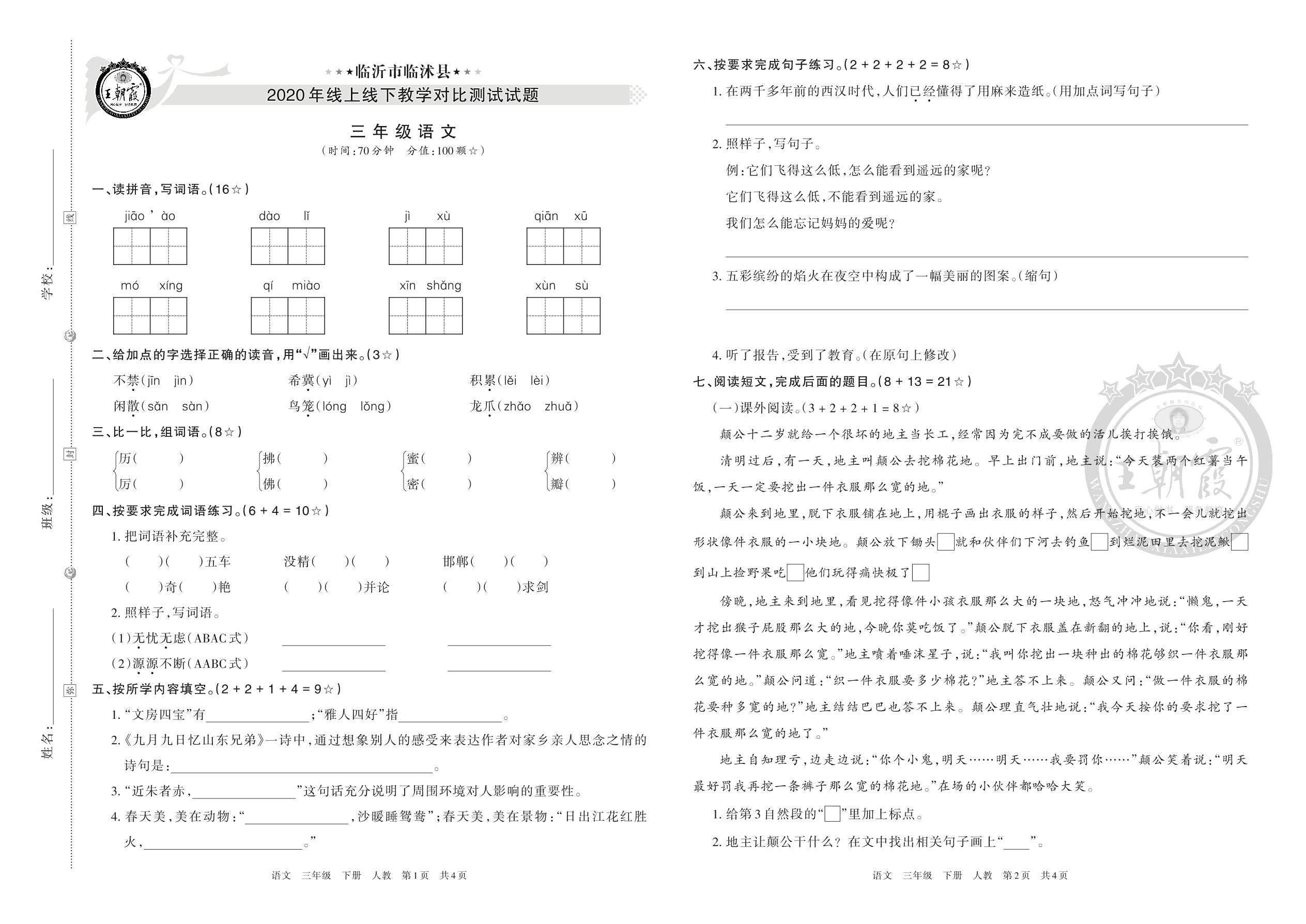临沂市临沭县2020年线上线下教学对比测试试题三年级语文(人教版)