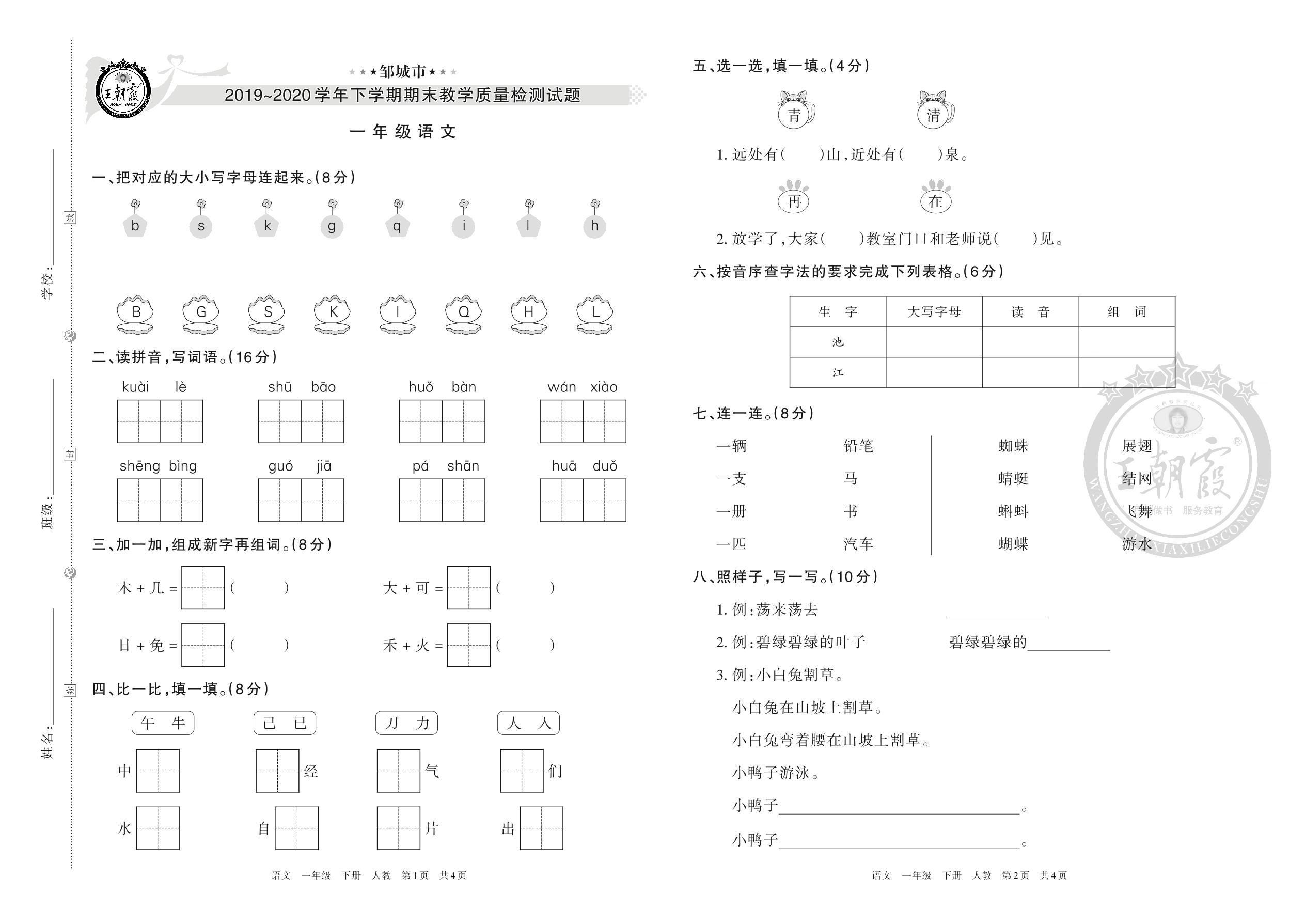 邹城市2019~2020学年下学期期末教学质量测试题一年级语文(人教版)