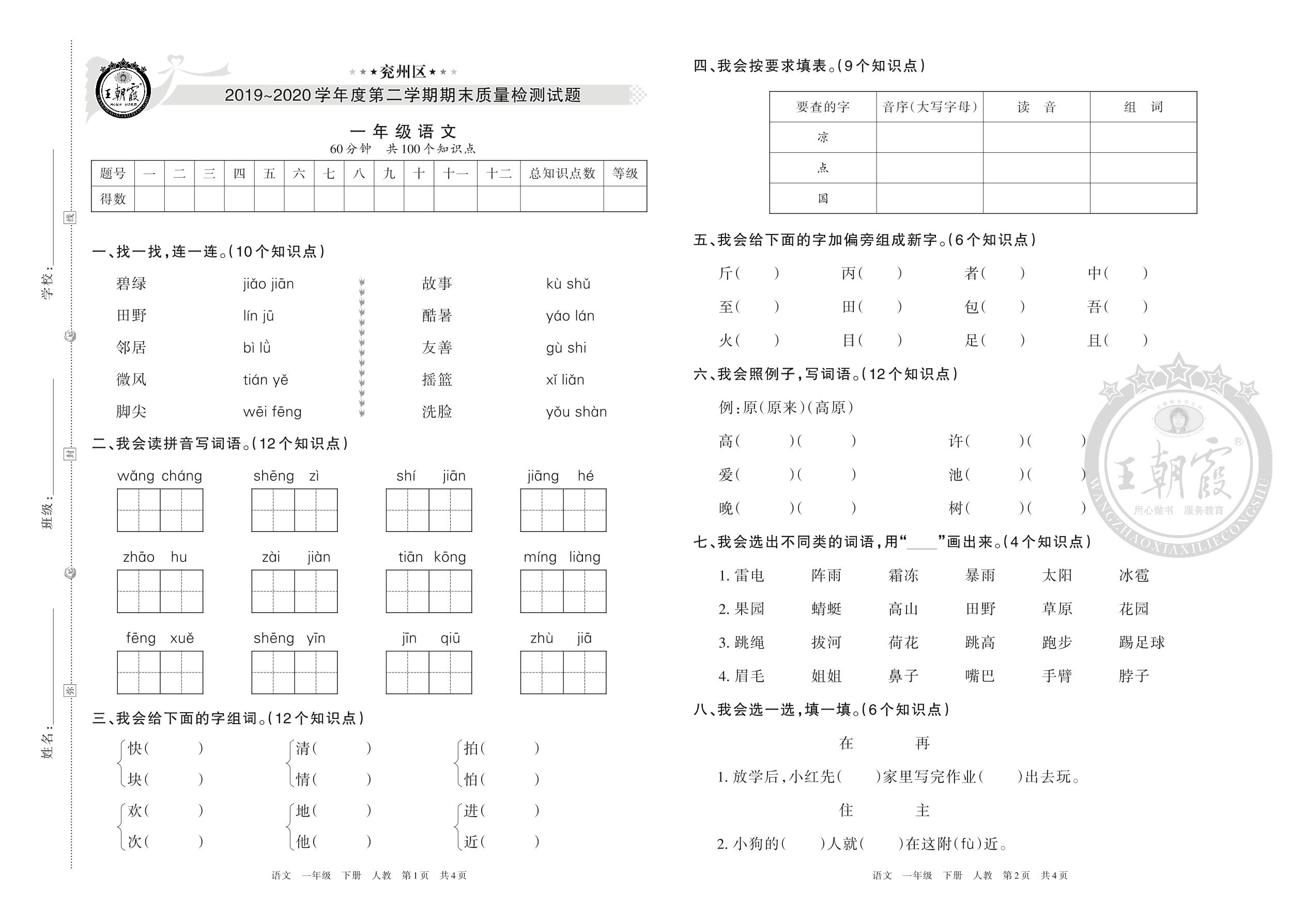 兖州区2019~2020学年度第二学期期末质量检测试题一年级语文(人教版)